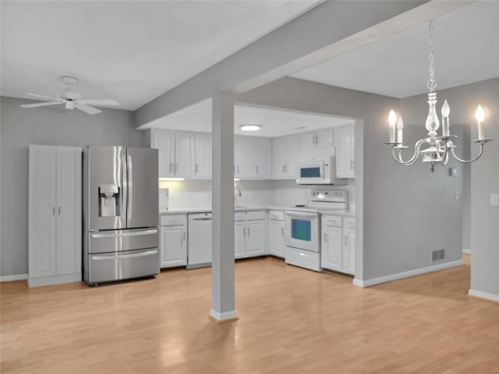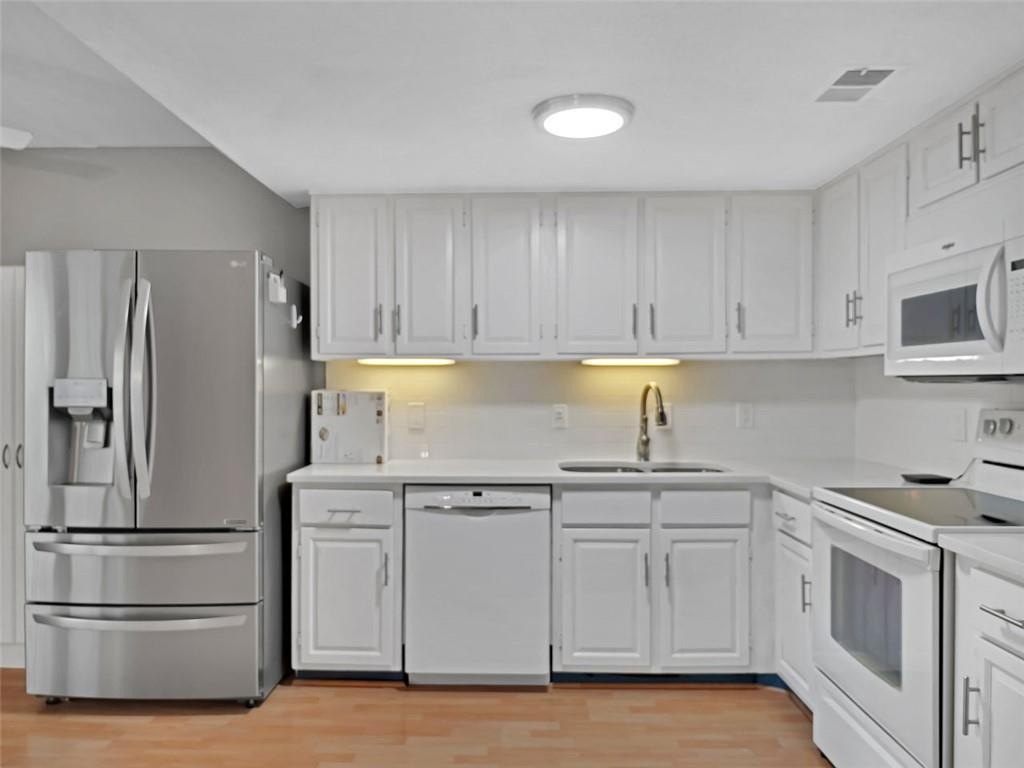 The heart of the home is the kitchen and this one doesn’t disappoint. Crisp white cabinetry with brushed nickel hardware, classic subway tile backsplash, sleek countertops, and a deep stainless-steel sink set the tone. Whether you’re cooking for one or hosting the holidays, the layout flows effortlessly and feels just right.