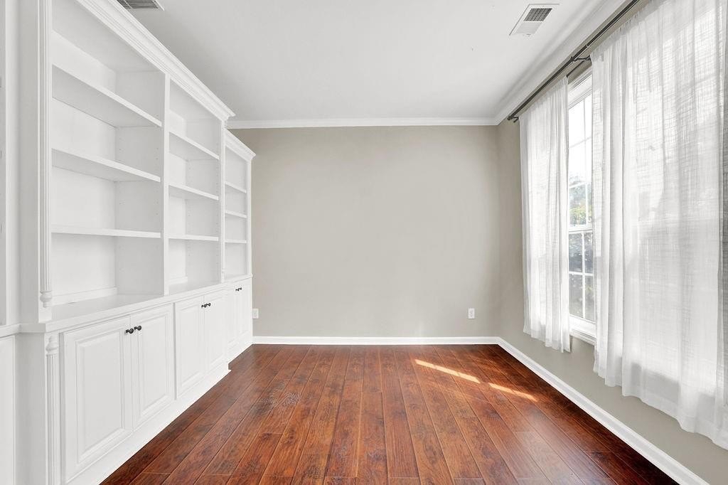 Inside, the floor plan is designed for both everyday living and entertaining. The gourmet kitchen features granite countertops, a double oven, and a seamless flow into the large living room perfect for gatherings with family and friends. Just off the kitchen, the formal dining room provides the ideal space for holiday dinners, while the private office/library with glass doors and custom built-ins makes working from home a pleasure.