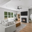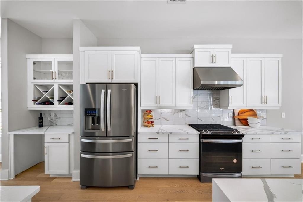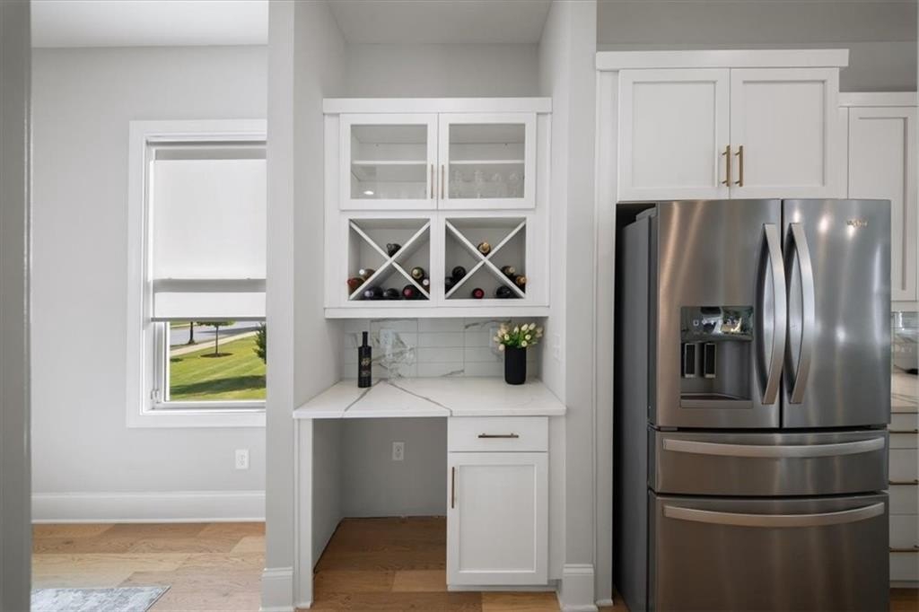Inside, enjoy wide-plank white oak hardwoods, soaring 10-ft ceilings, and an open-concept main level perfect for modern living. The fireside family room features a 5-speaker surround sound system, while the chef’s kitchen impresses with a Calacatta quartz waterfall island, Whirlpool appliances, under-cabinet lighting, and a convenient dry bar. A dedicated dining room and sunny breakfast nook complete the space.