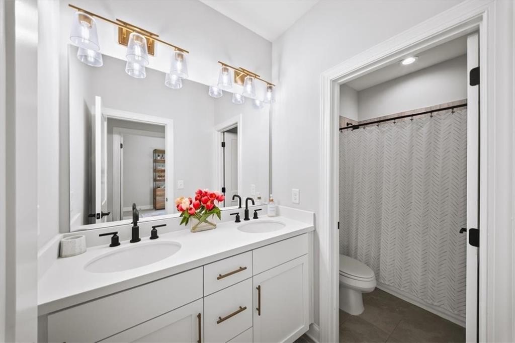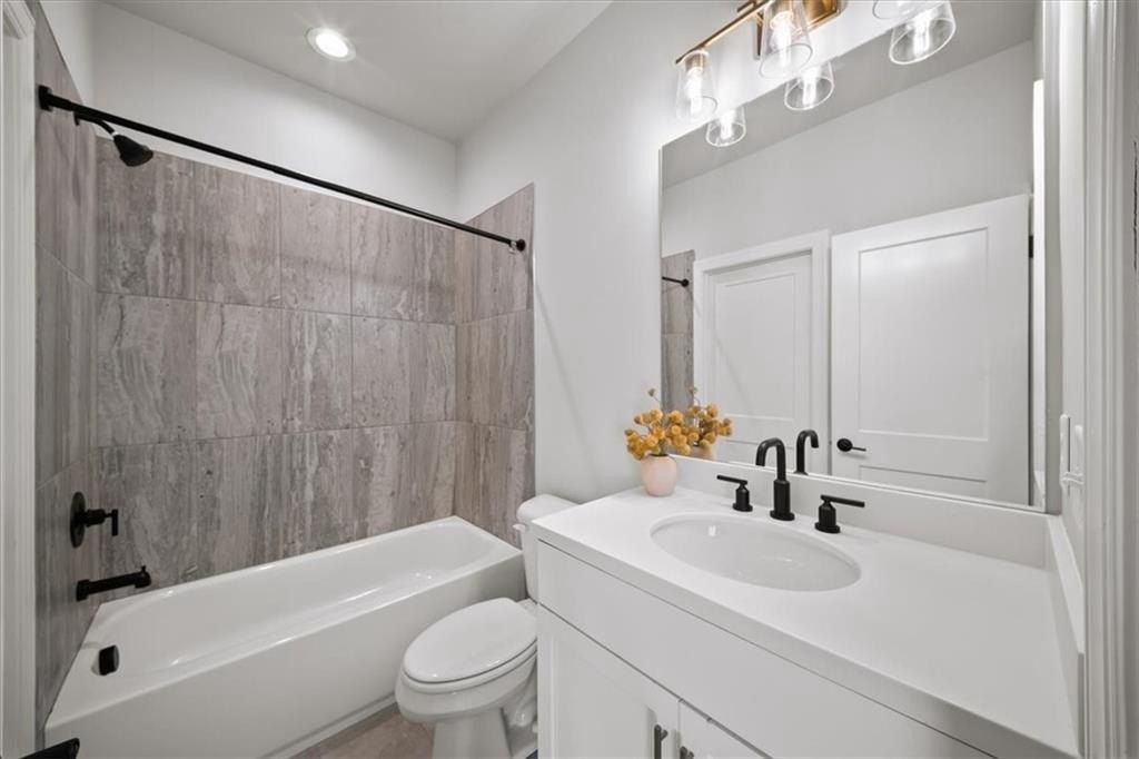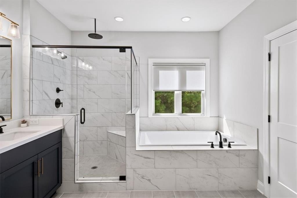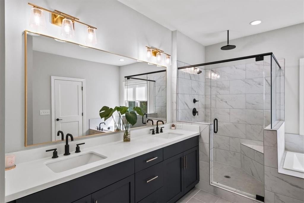 Upstairs, the spacious primary suite offers a spa-style bath with soaking tub, dual vanities, and a tiled walk-in shower with dual showerheads—including a rainfall option—as well as a generous walk-in closet. A private guest suite with en-suite bath and two additional bedrooms with a shared hall bath round out the second floor.