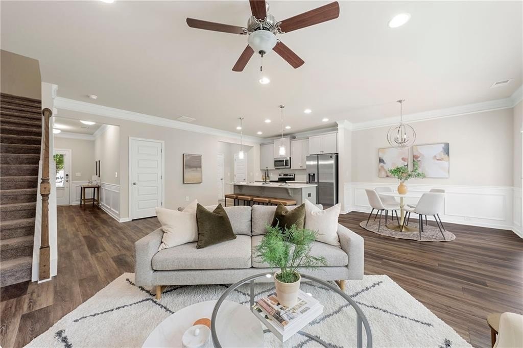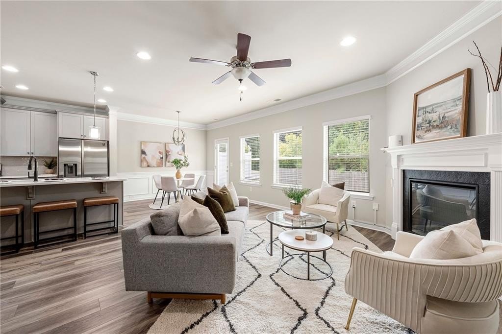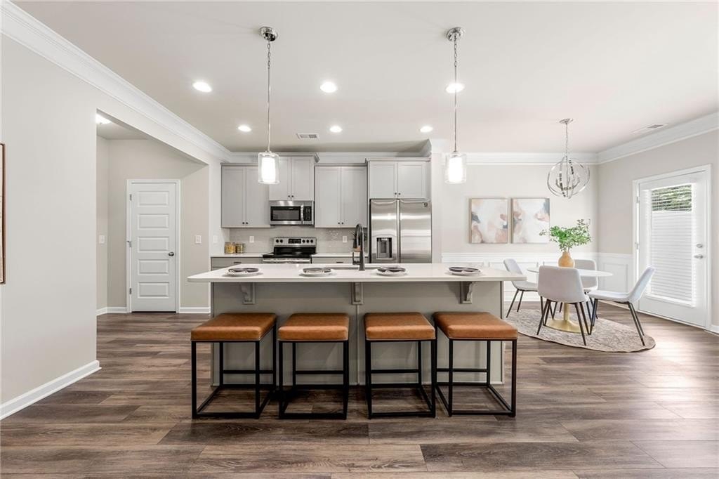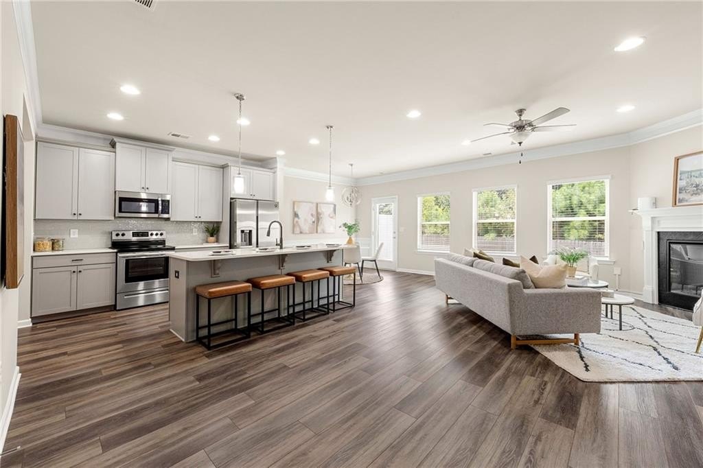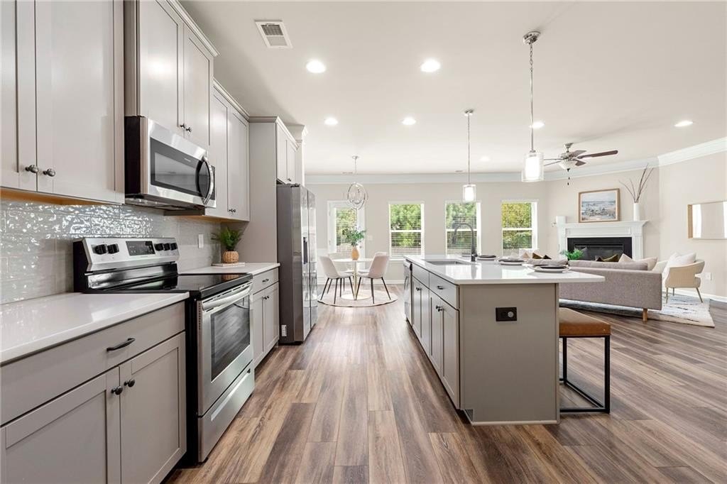 Step inside to find a light-filled open concept main level featuring a spacious living room with crown molding, LVT flooring, and custom details throughout. The kitchen is a showstopper equipped with stainless steel appliances, quartz counters, gray shaker cabinets, and a large center island perfect for hosting or daily life.