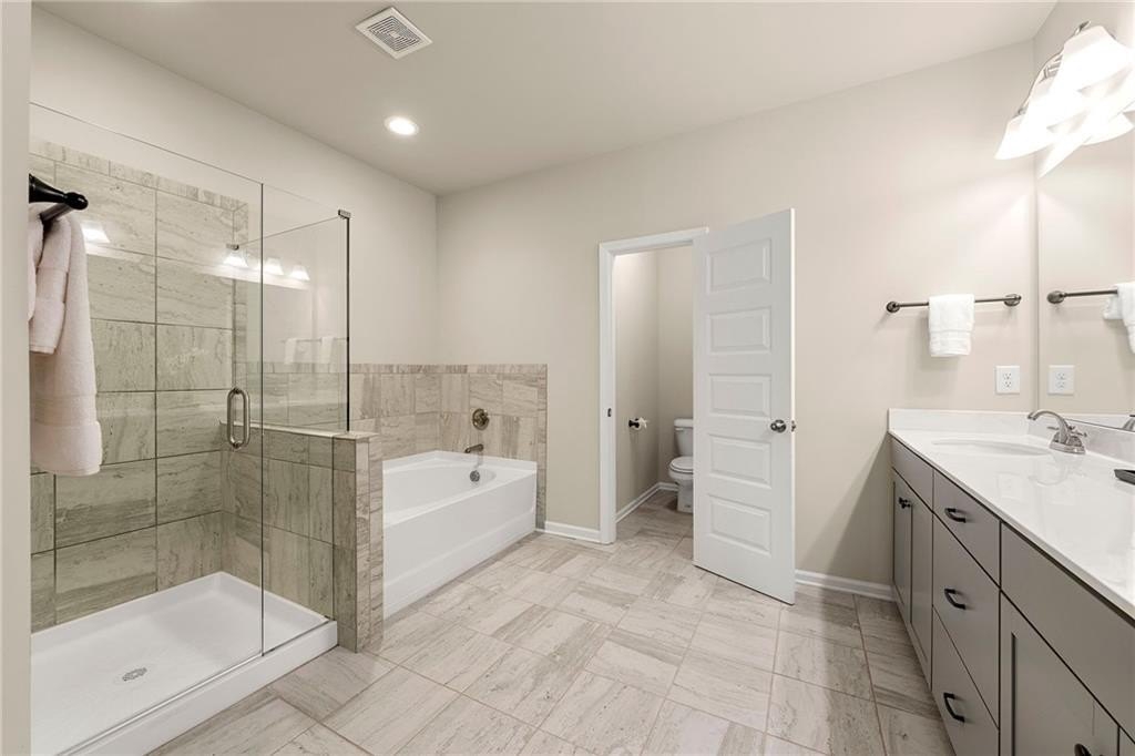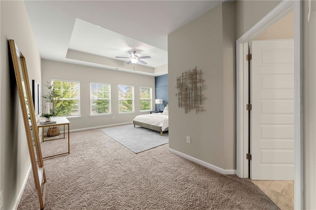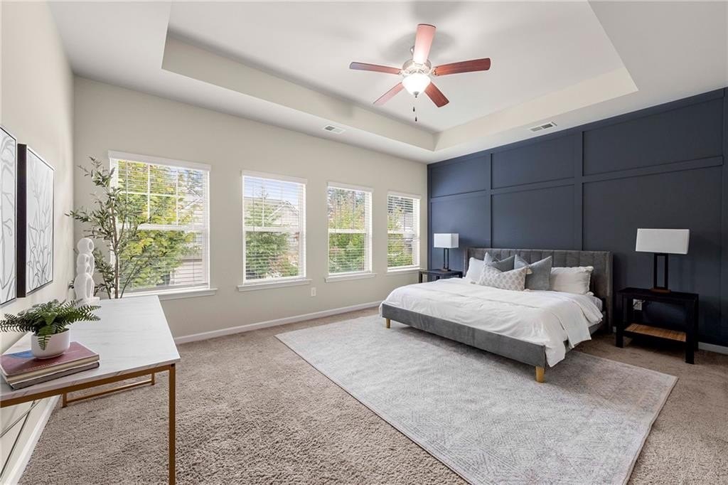 Upstairs, retreat to the oversized primary suite with a tray ceiling and serene natural light. The spa-inspired en-suite bathroom features a double vanity, soaking tub, walk-in shower, and generous closet space. Two additional bedrooms, a full bath, and a convenient upstairs laundry room complete the second level.