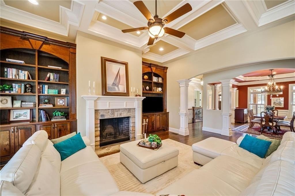 Step inside to an open and inviting main-level design, where soaring ceilings, elegant architectural details, and seamless flow define the living spaces. The luxurious owner’s suite is a sanctuary of comfort, featuring a spa-like bath with double vanities, a spacious tiled shower, a soaking tub with picturesque views, and two oversized walk-in closets. The gourmet chef’s kitchen is a dream for culinary enthusiasts, equipped with Viking appliances, double ovens, a six-burner gas cooktop, a massive island, granite countertops, custom cabinetry, and a walk-in pantry. Adjacent to the kitchen, a cozy keeping room with a stone fireplace creates a warm and inviting atmosphere.