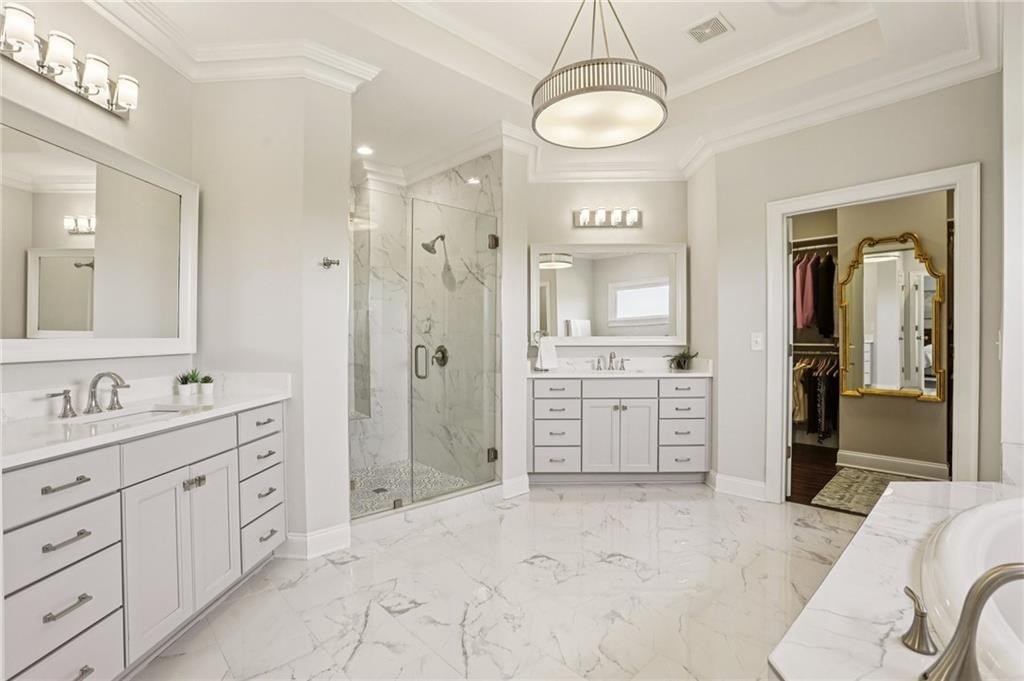 Retreat upstairs to the oversized primary suite, featuring separate vanities, a soaking tub, step-in glass shower, and a walk-in closet designed to impress. Watch the sunset every evening from the private back deck, your own personal stage for unforgettable moments.