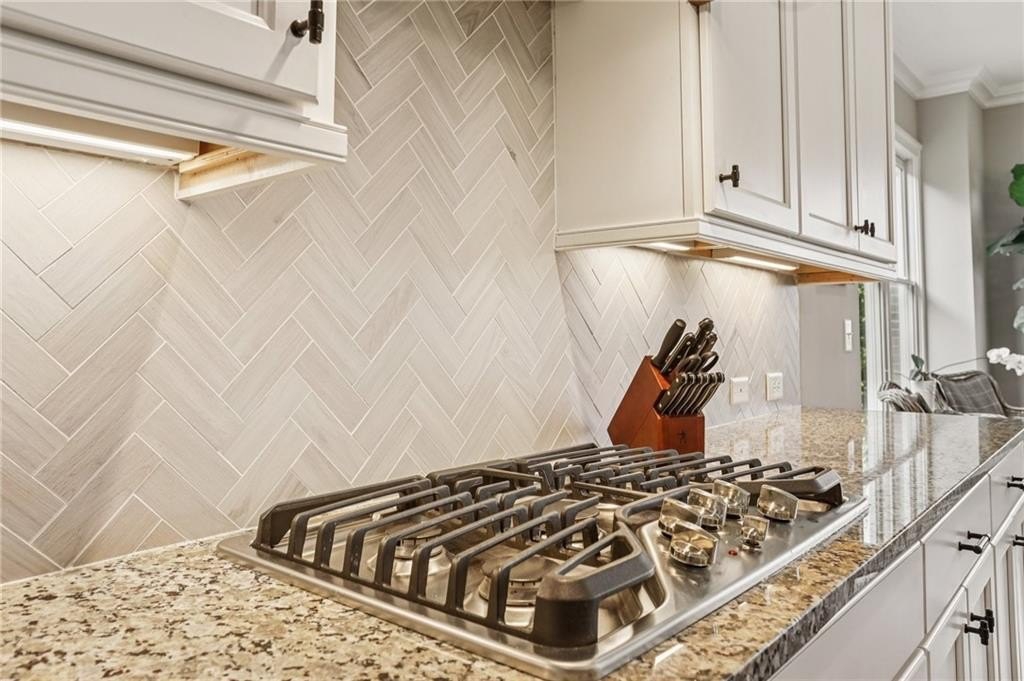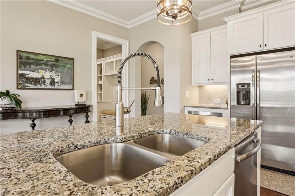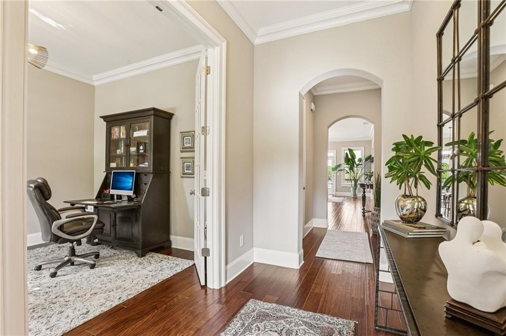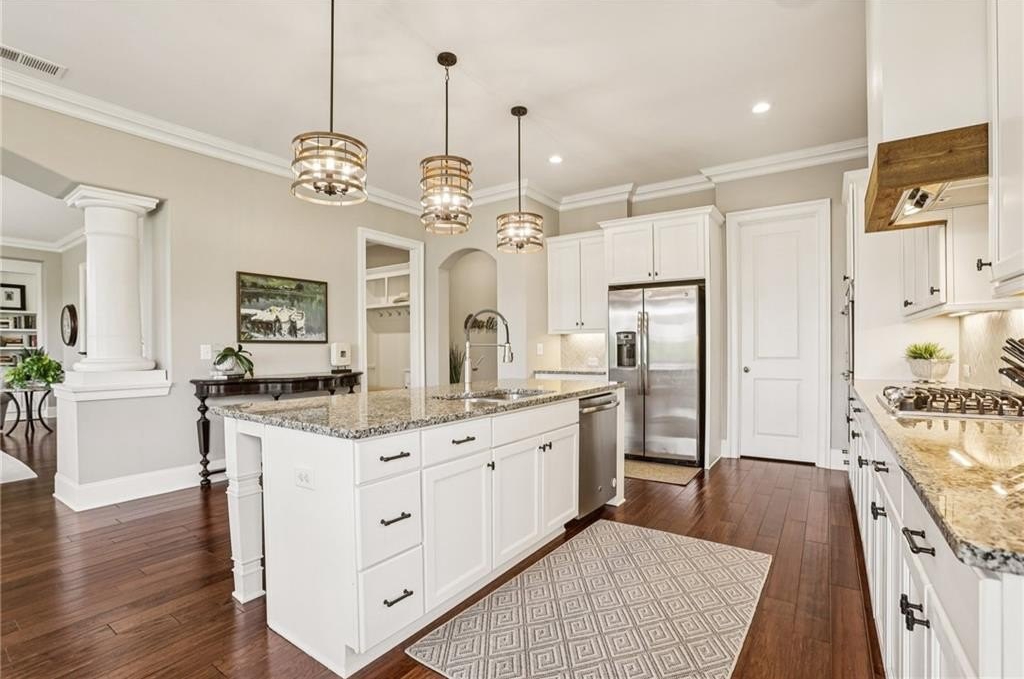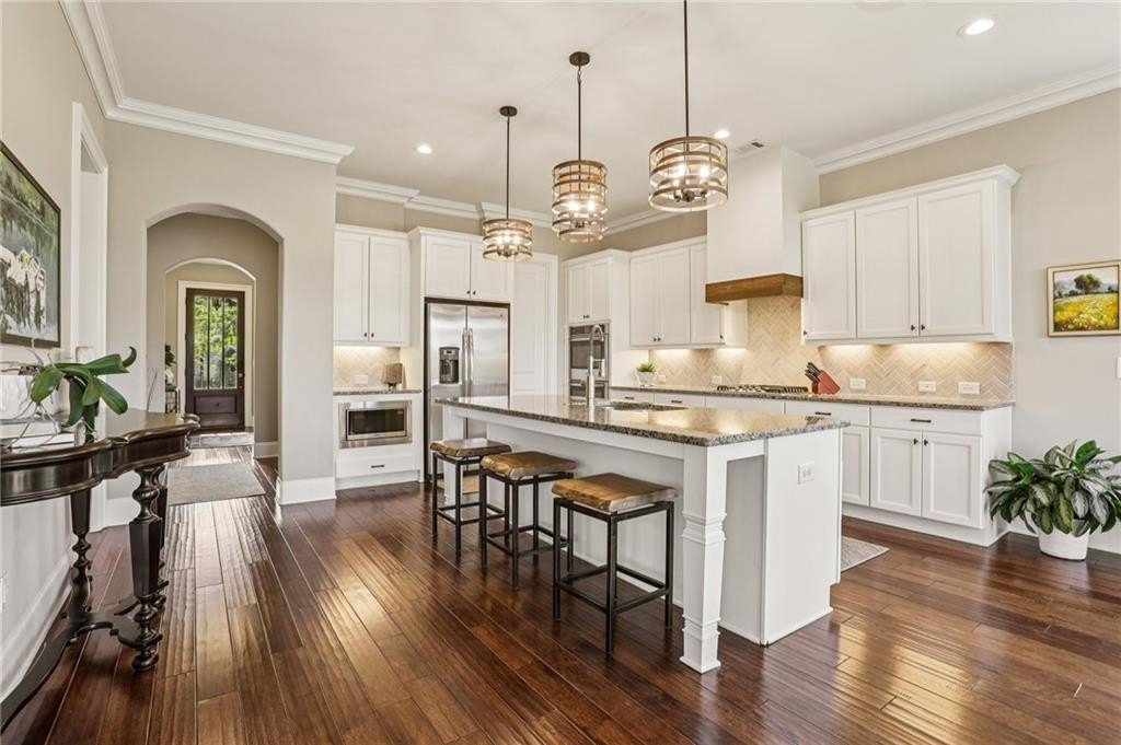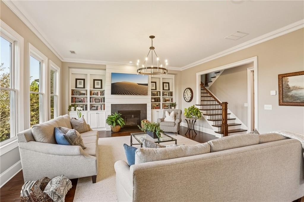 Step inside to discover a light-filled interior with gleaming hardwood floors, crown molding, built-in bookshelves, and custom closet systems. The home office offers a perfect place for productivity. The family room is centered around a show-stopping fireplace, ideal for cozy evenings. The gourmet kitchen is a chef’s delight with island seating, upgraded appliances, granite counters, tile backsplash, and a spacious walk-in pantry, making meal prep and entertaining a pleasure.