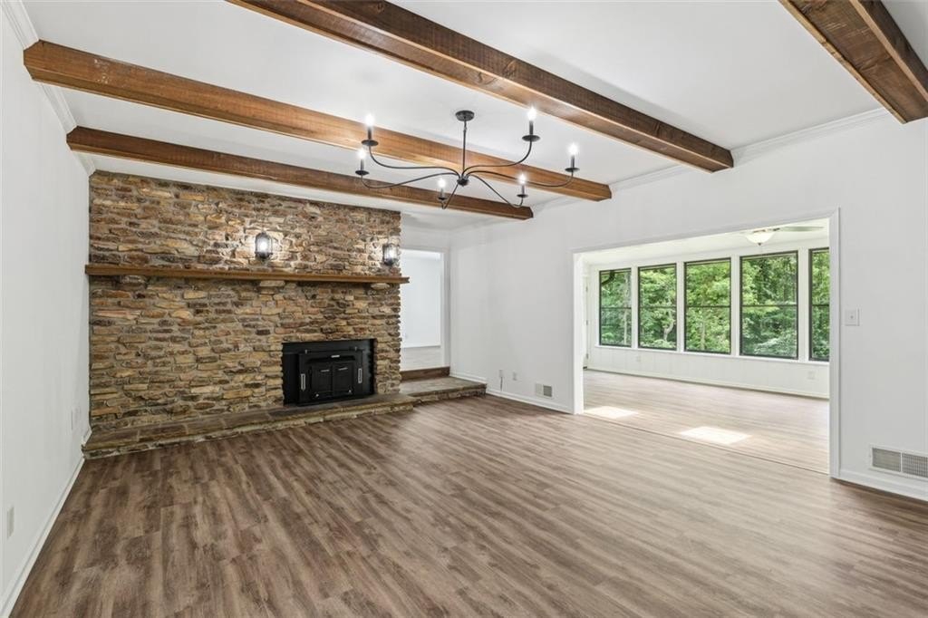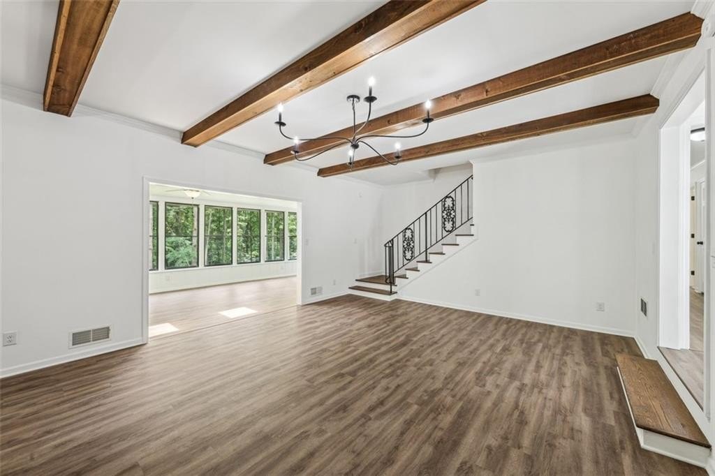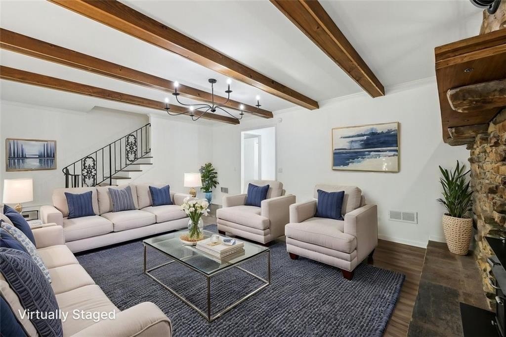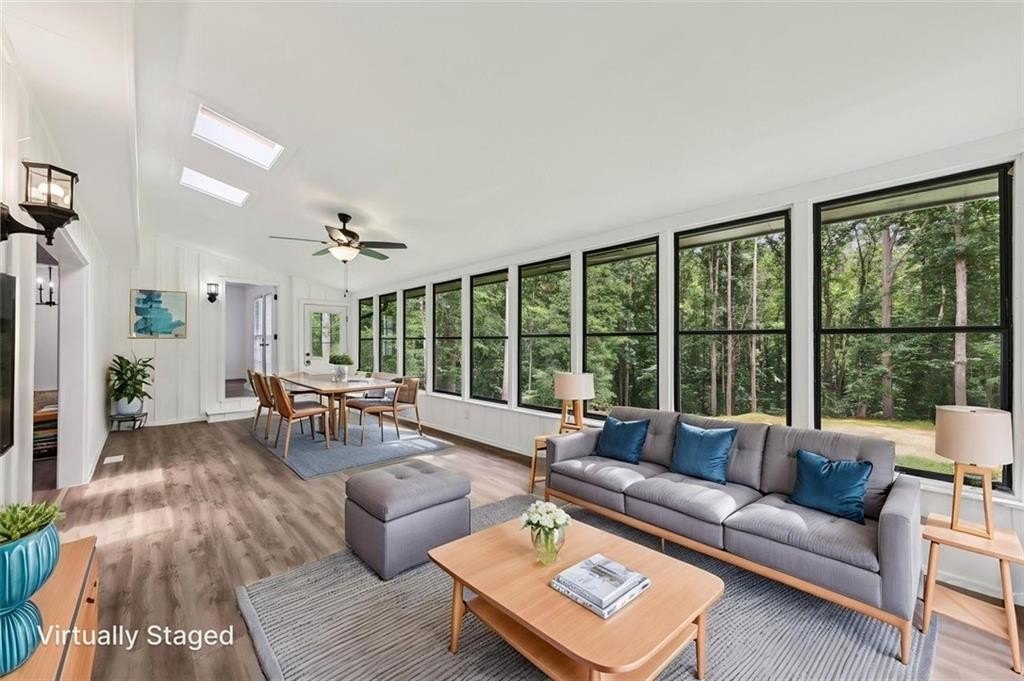 Step inside to discover a spacious open concept floor plan with vaulted beam ceilings, new finishes, and designer details throughout. The highlight of the home is the expansive sunroom, now fully integrated into the living space, featuring a wall of windows and skylights that flood the room with natural light while providing serene views of the picturesque backyard.