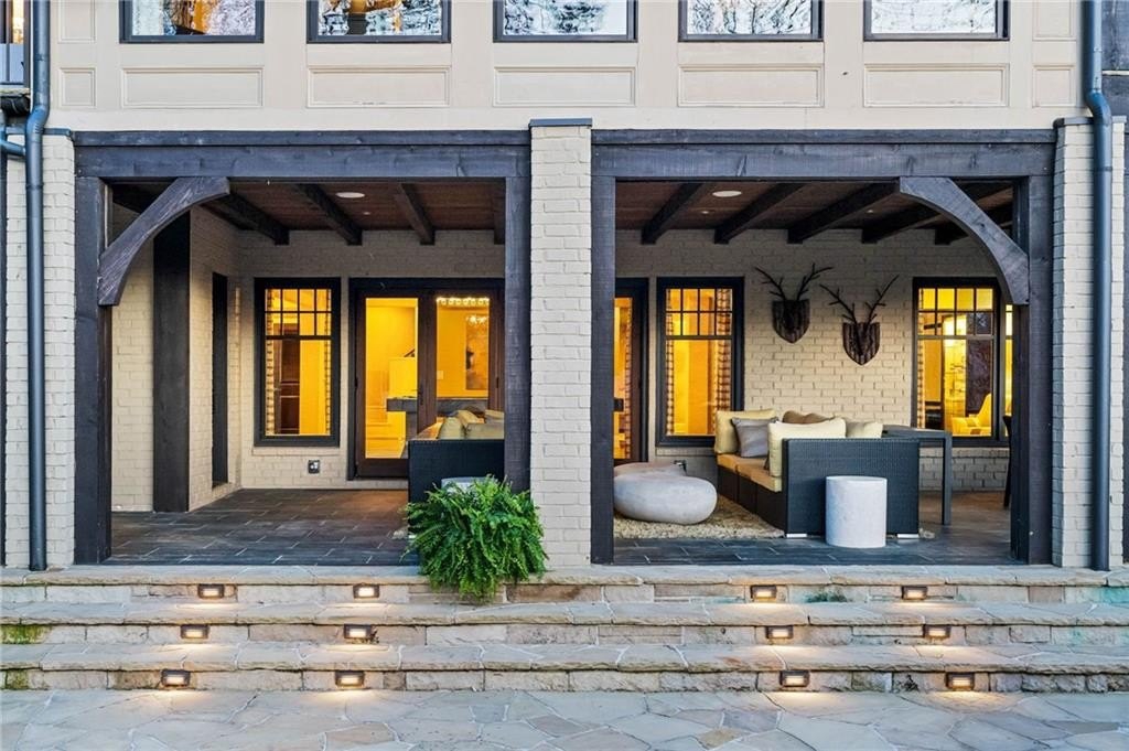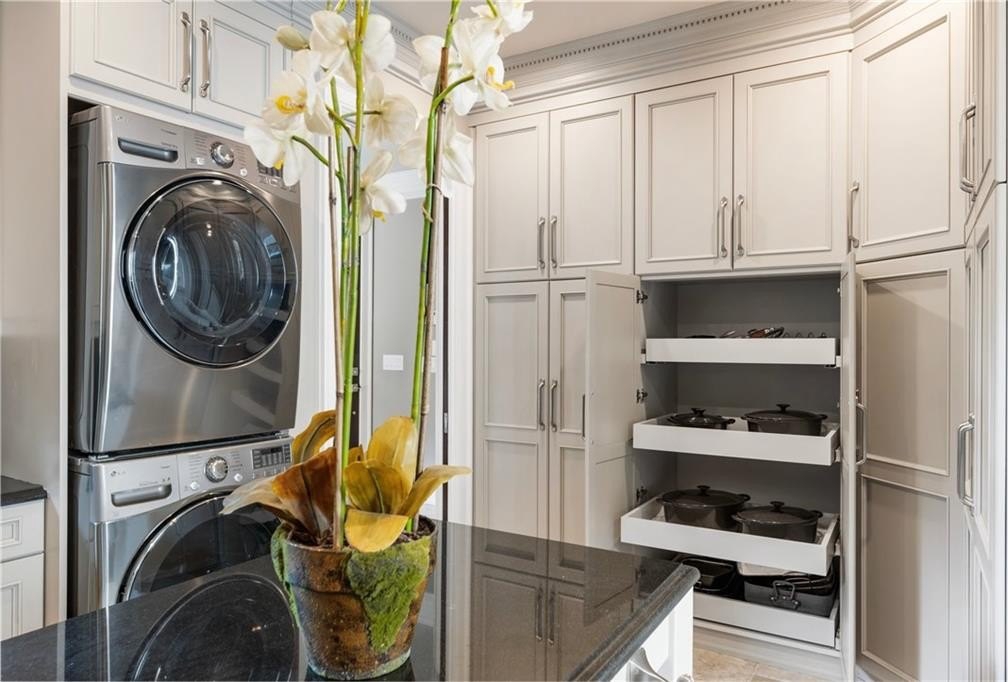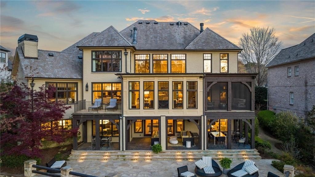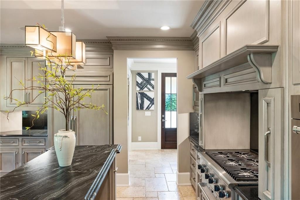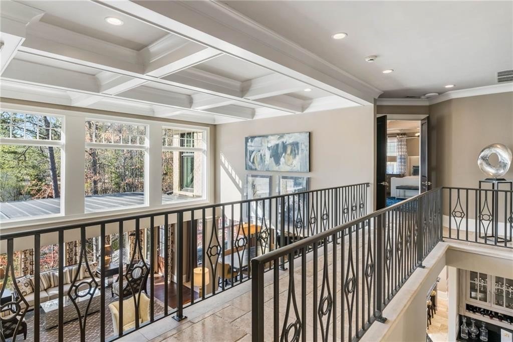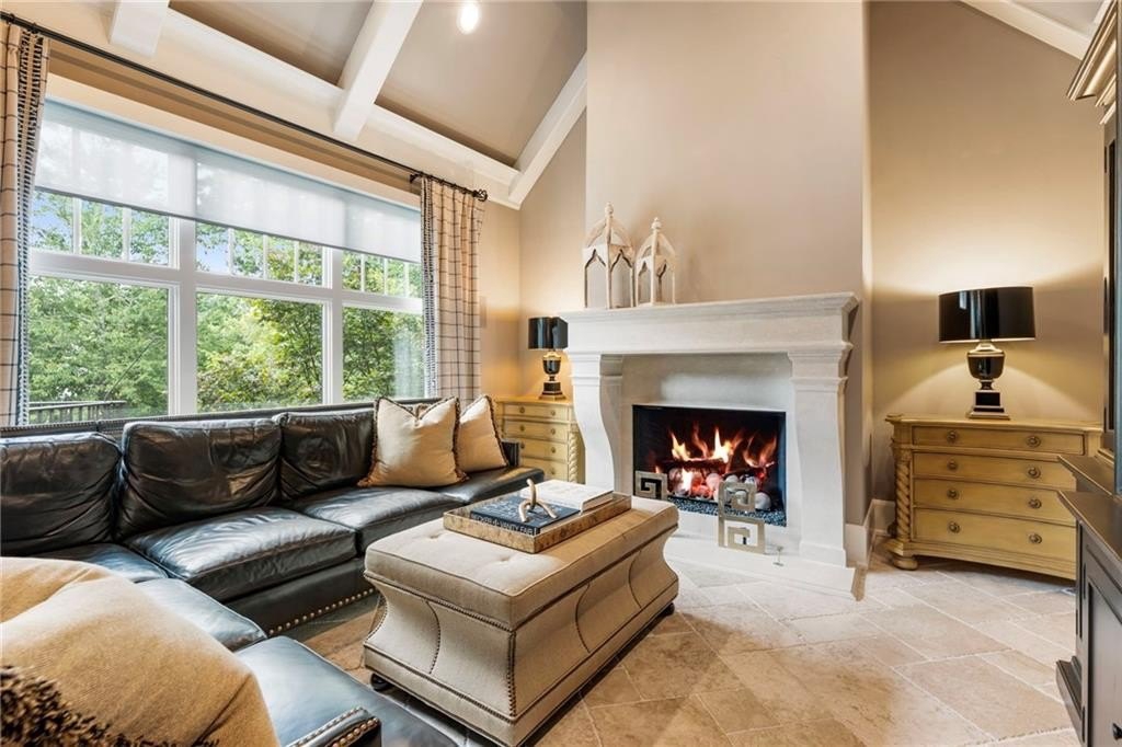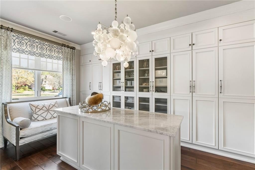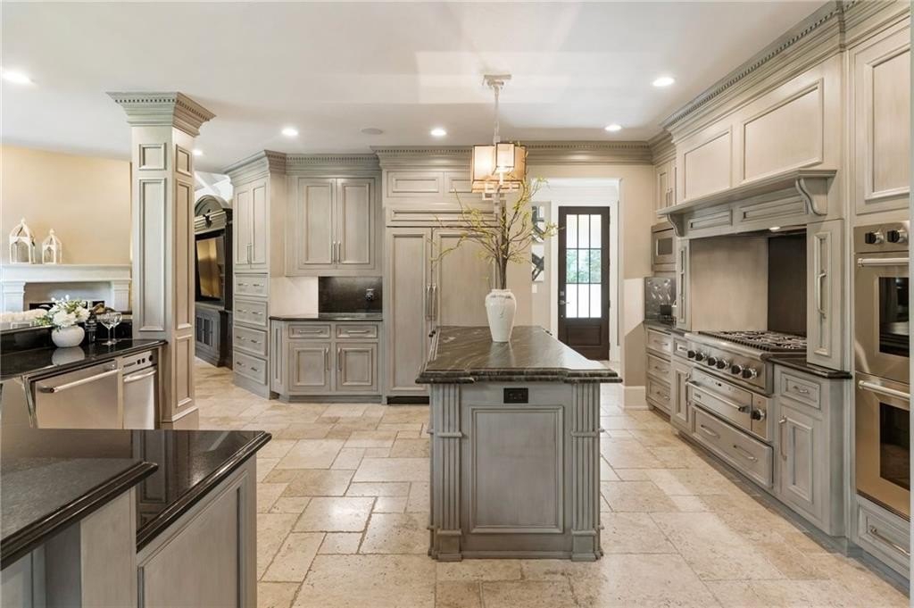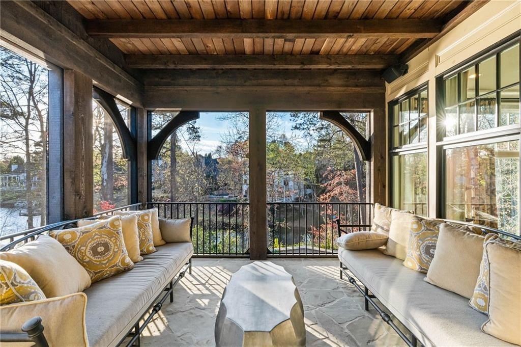 The two-story great room features a limestone fireplace and coffered ceiling with integrated lighting, leading to a bright sunroom and upper-level decks that capture stunning Lake Windward views. The kitchen is a culinary masterpiece, complete with leathered granite counters, state-of-the-art appliances, and a hidden catering kitchen/scullery with its own built-in smoker and grill system—perfect for entertaining.