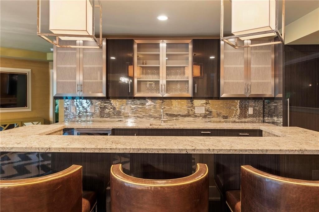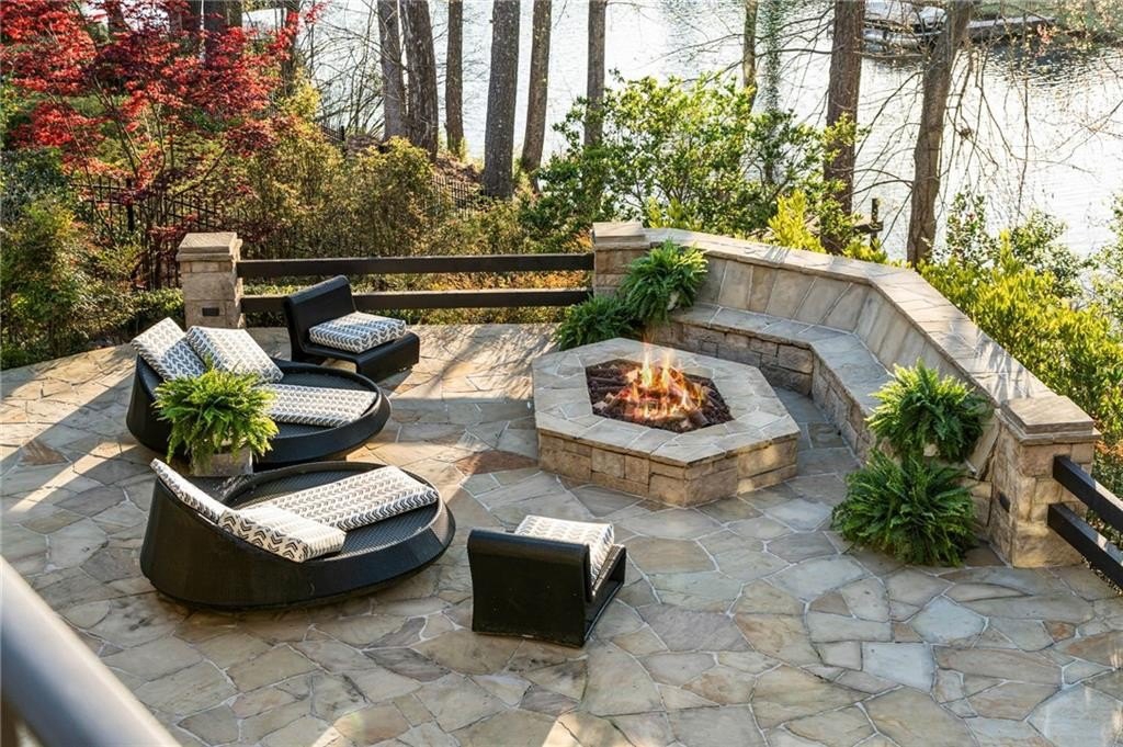 The terrace level is a full entertainment destination, boasting a bar with crystal tile, a home theater, a game room with herringbone plank floors, and a guest suite with spa bath and separate fitness room. Accordion-style glass doors open to a covered porch with Phantom screens, a stone patio with built-in firepit, and curved stairs leading to your private dock.