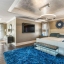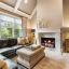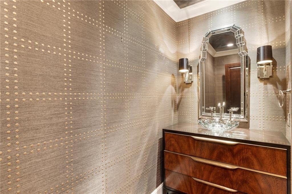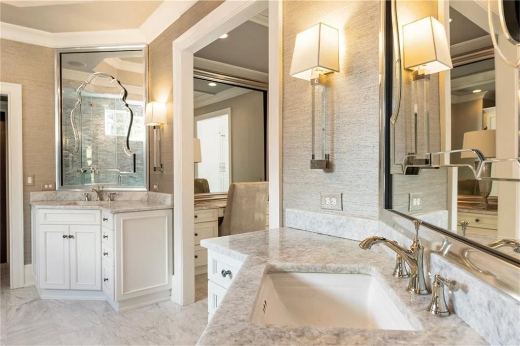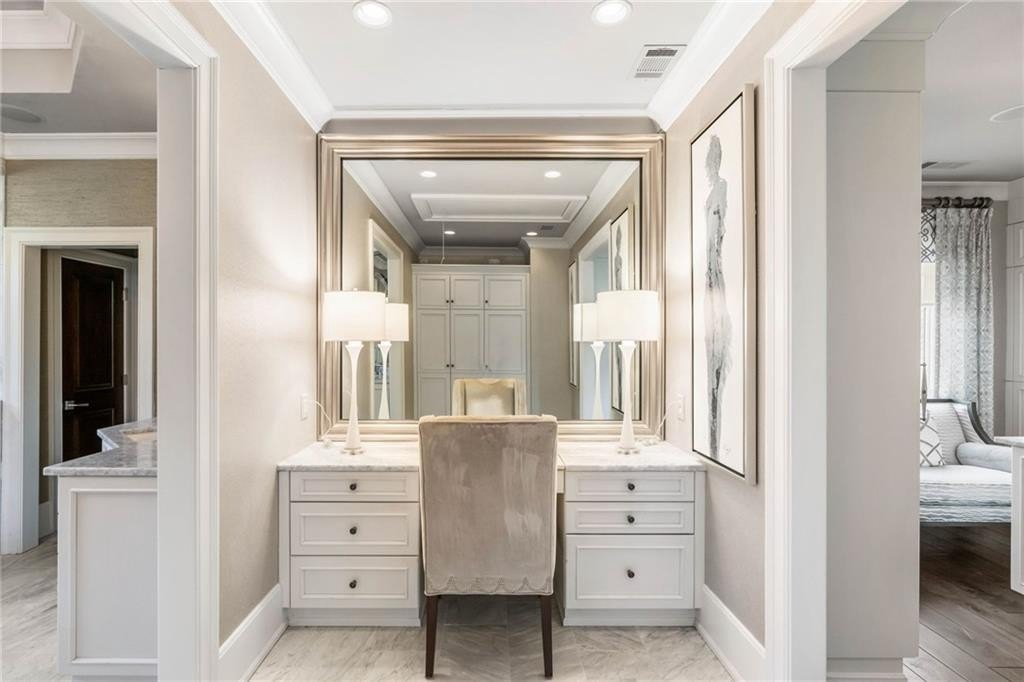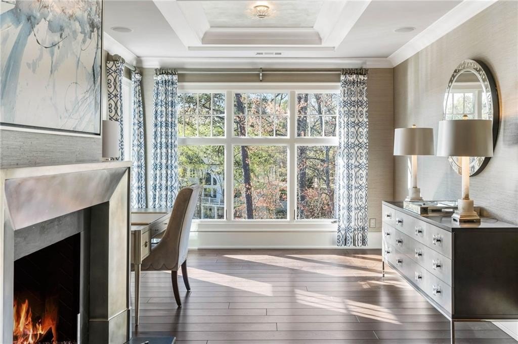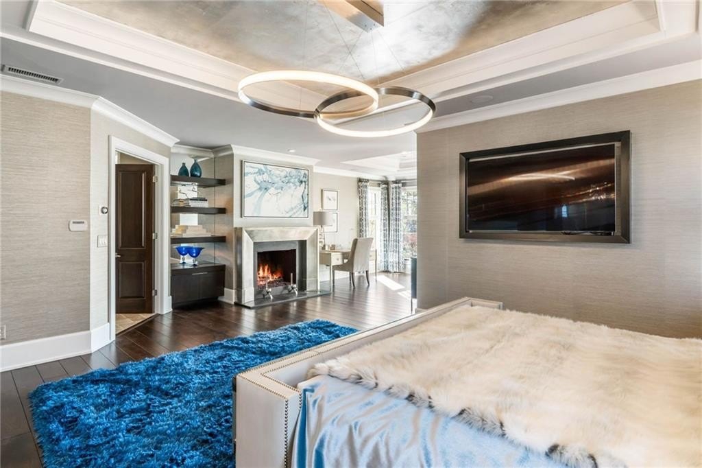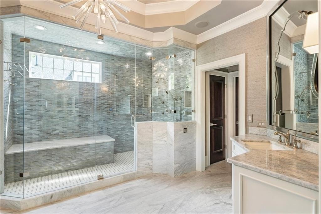 Upstairs, the primary suite is a true retreat: a tray-ceilinged bedroom with fireplace, a spa-inspired bathroom with heated Carrara marble floors, a glass-enclosed steam shower with eight jets, and two expansive designer dressing rooms, each with custom cabinetry and vanities.