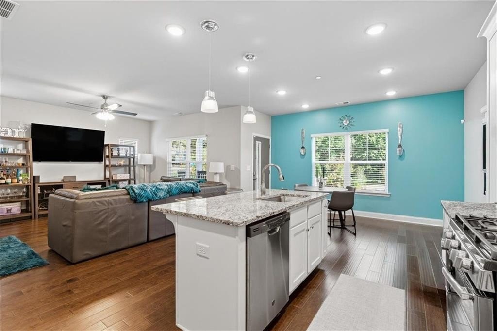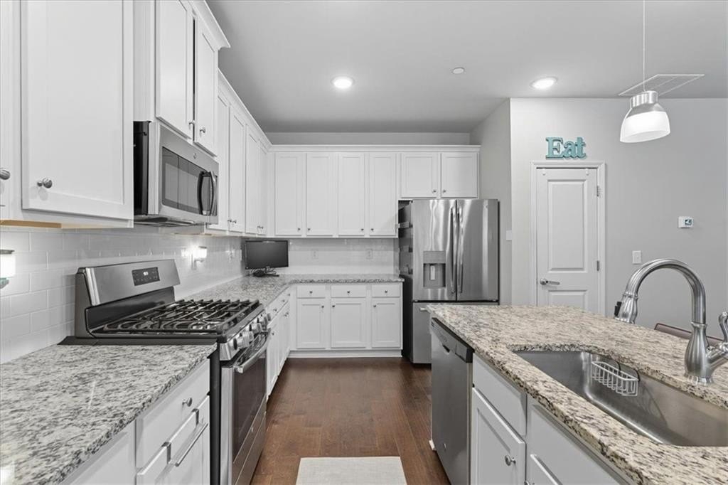 The gourmet kitchen is a chef’s dream, featuring granite countertops, a center island with bar seating, ample cabinetry, and stainless-steel appliances. Its open layout provides a seamless view to the family room, making entertaining effortless. The family room, with its high ceilings and plentiful natural light, is the heart of the home. Perfect for cozy movie nights, lively game days, or simply relaxing with loved ones. Recessed and pendant lighting adds warmth and sets the perfect mood for any occasion.