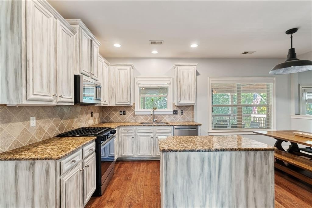 Just beyond, the heart of the home unfolds with a kitchen featuring granite countertops, stainless steel appliances, abundant cabinet space, and a functional island that keeps cooking and entertaining simple. The kitchen flows seamlessly into the breakfast room and fireside family room, where everyday living feels warm and connected.