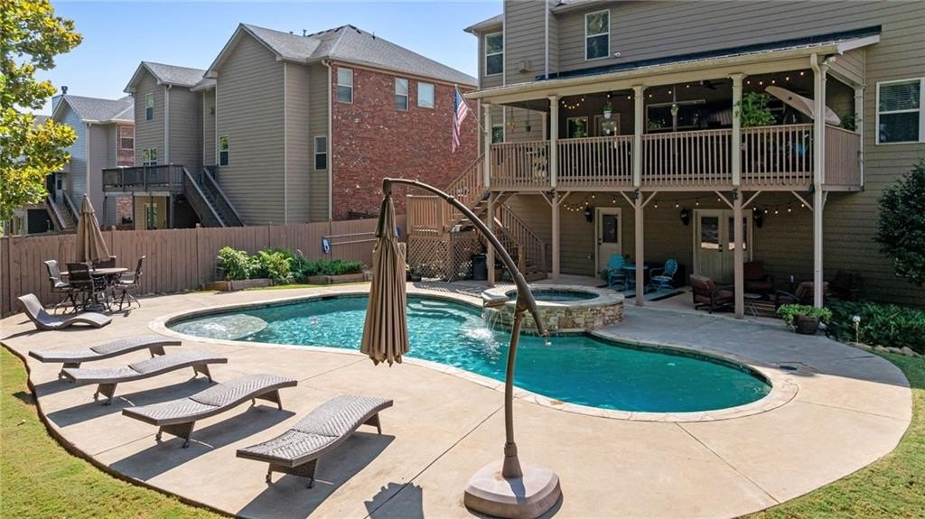Step outside to the oversized covered porch overlooking your private oasis — a sparkling gunite pool and spa set within a fenced backyard for privacy and peace of mind. Whether it’s summer afternoons spent by the water, crisp fall evenings grilling under the porch, or year-round relaxation in the heated spa, this outdoor retreat is designed for both play and rest. The pool is enhanced with a Jandy smart system controlled from your device, programmable heating and filtration, and has been professionally maintained weekly.