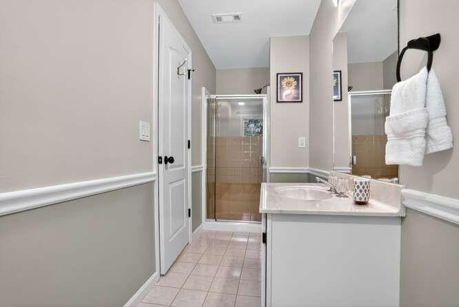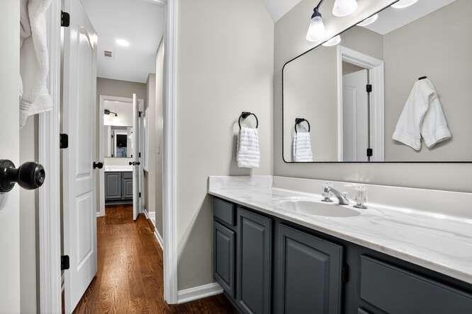 Upstairs, a bedroom with ensuite and two more bedrooms with a Jack-and-Jill bath offer plenty of space for family or guests.
