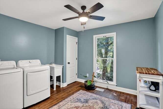 The open floor plan is designed for family and entertainment and filled with natural light. The generous kitchen features quartz counters, breakfast bar, walk-in pantry, and keeping room so the cook can stay connected to the fun. A spacious laundry room with utility sink and plenty of storage adds everyday convenience.