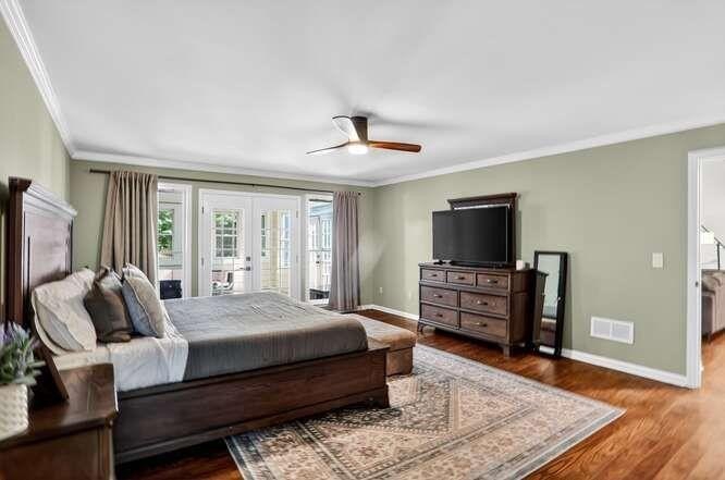 The owner’s suite is on the main level, complete with a luxuriously upgraded bath and private deck overlooking a tranquil pond and waterfall—your own backyard retreat.