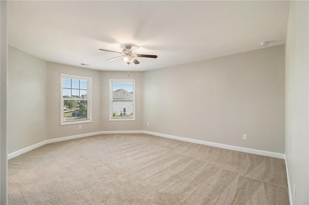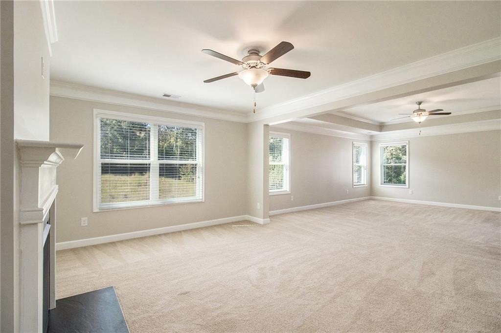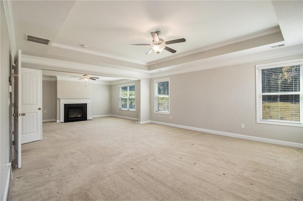 Upstairs, the owner’s suite is a true retreat, featuring a private sitting room with its own fireplace, a spa-style bathroom with double vanities, garden tub, tiled shower, and an expansive walk-in closet. The second level also includes three additional spacious bedrooms—one with a private bath and two sharing a full bath—plus a conveniently located laundry room.