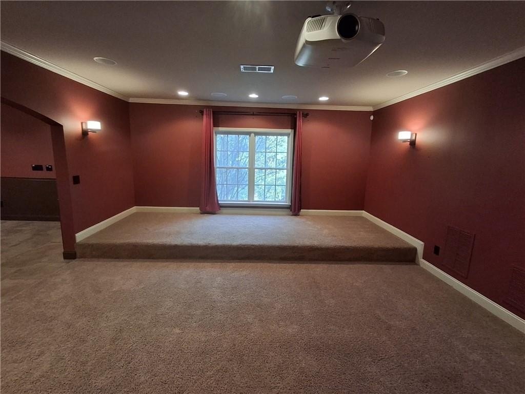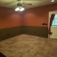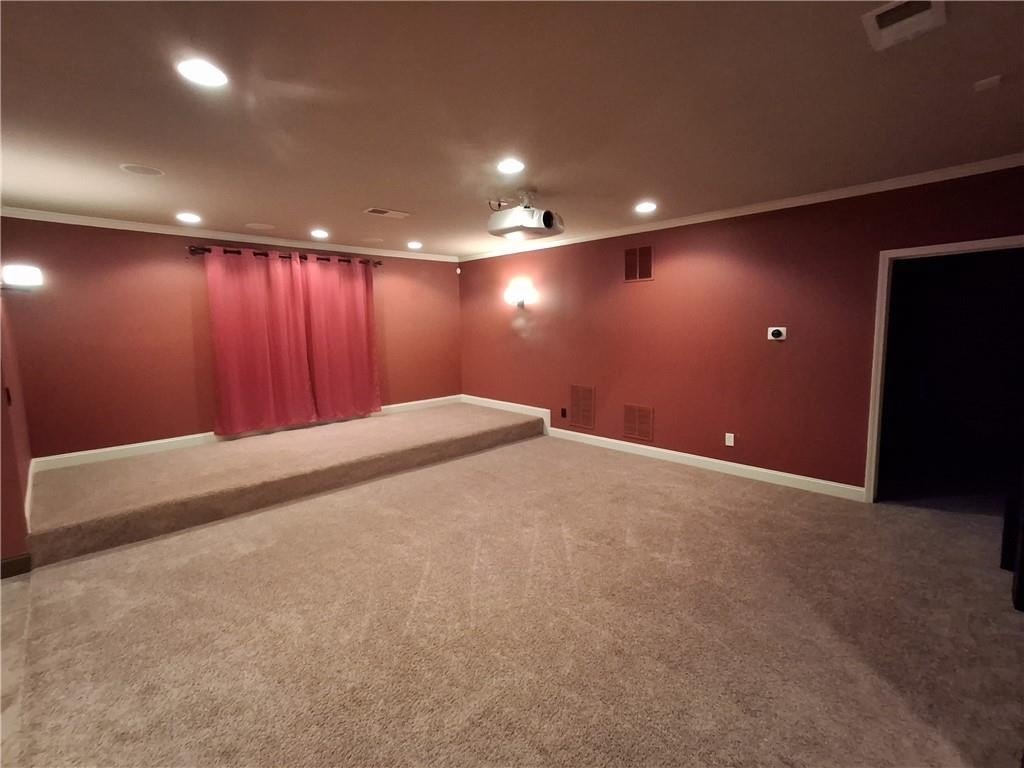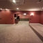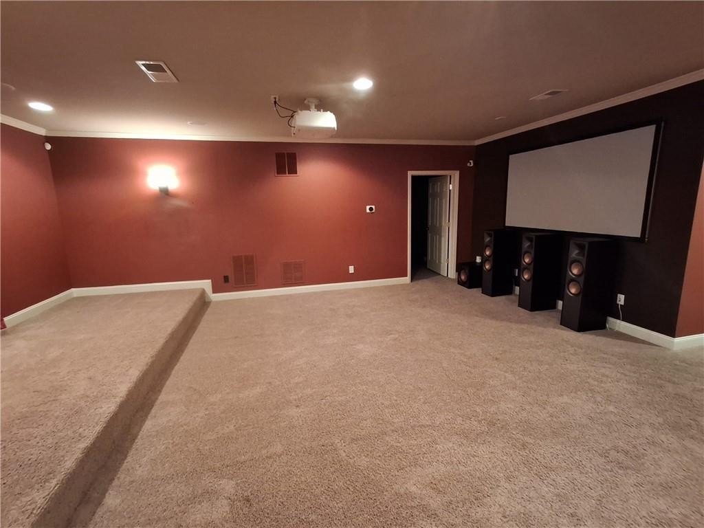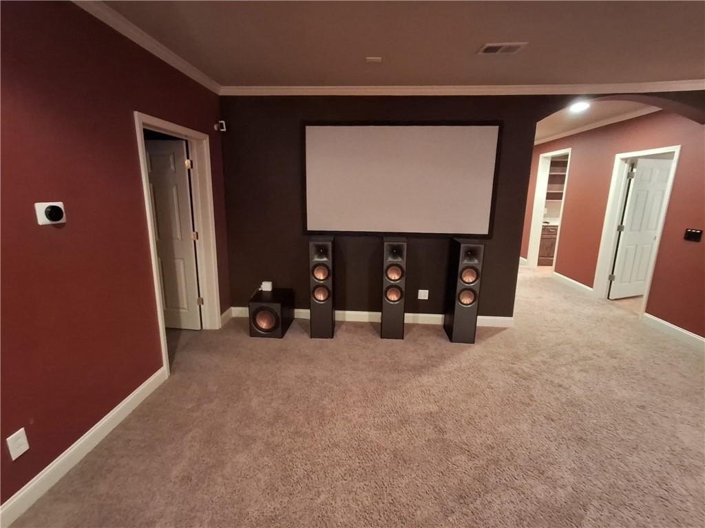 Fully wired home theater with surround sound speakers in ceiling and 100 inch projector screen