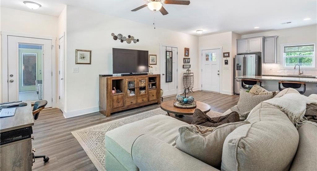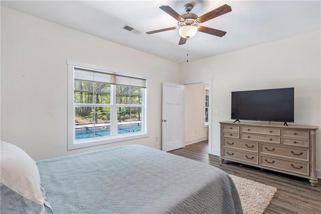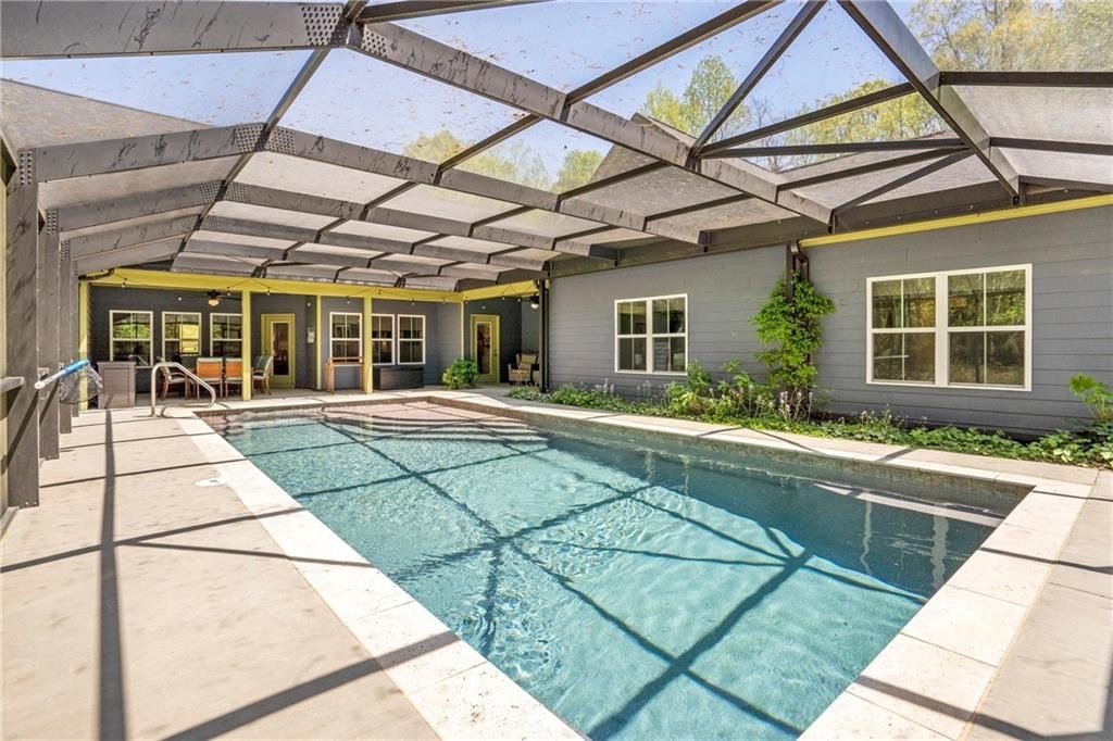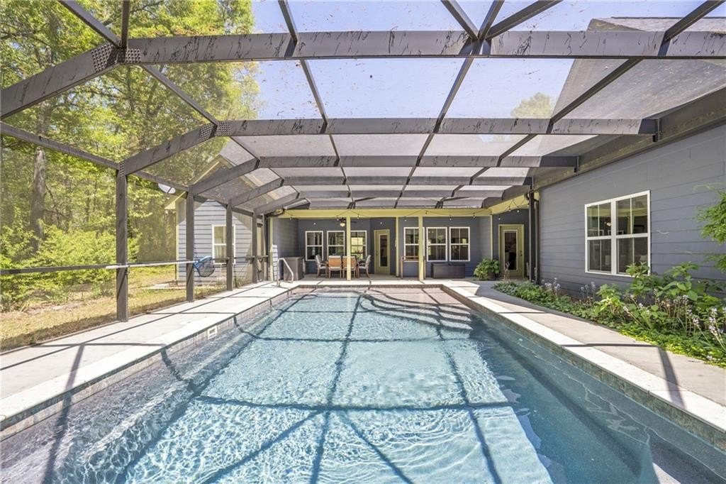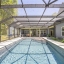 An attached private guest suite offers complete independence with a full kitchen, comfortable living room, large bedroom, spacious bathroom, and walk-in closet—perfect for extended family or visitors. Both residences overlook a luxurious saltwater pool with a screened lanai enclosure, creating a seamless indoor-outdoor lifestyle and an ideal setting for year-round relaxation and entertaining.