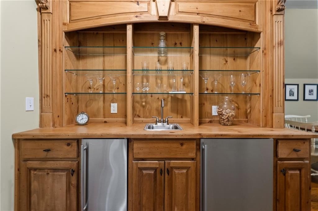 The main-level primary suite offers a spa-inspired bath with heated floors, a zero entry shower and a spacious custom closet, while the upstairs primary suite mirrors its luxury. Two additional bedrooms share a well-appointed bath, and the generous bonus room is a showstopper, complete with a custom pine bar with sink, refrigerator, and ice maker, a space that feels like a private old-world pub. Permanent stairs lead to a huge attic, making storage simple and accessible, while multiple custom closets (including a gift-wrapping hub) maximize organization.