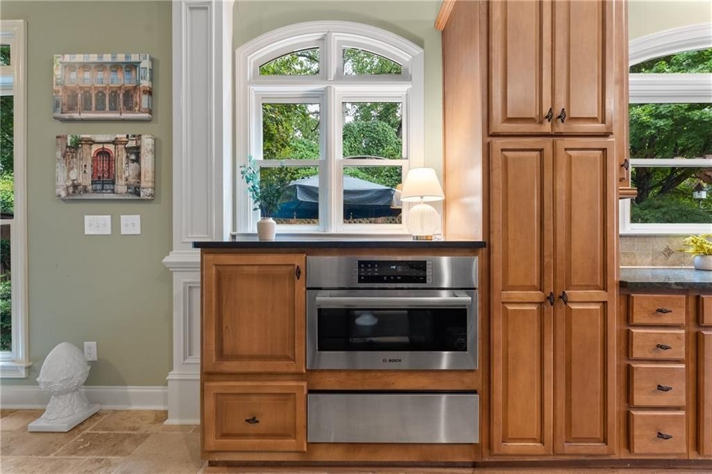 Designed for the discerning chef, the gourmet kitchen features a 36-inch Wolf dual-fuel range with central griddle, Bosch SilencePlus dishwasher, Bosch refrigerator, Bosch microwave and warming/proofing drawer, plus granite counters, and extended island, deep drawers and pull-out shelving. The great room and kitchen flow seamlessly to the lushly landscaped courtyard, an entertainer’s dream and a serene private escape.