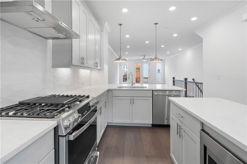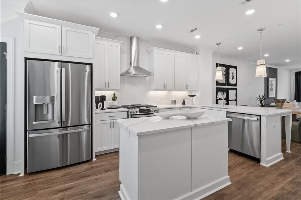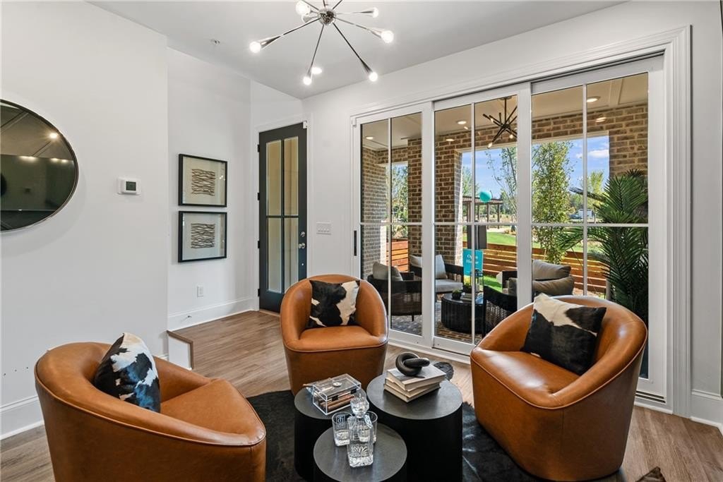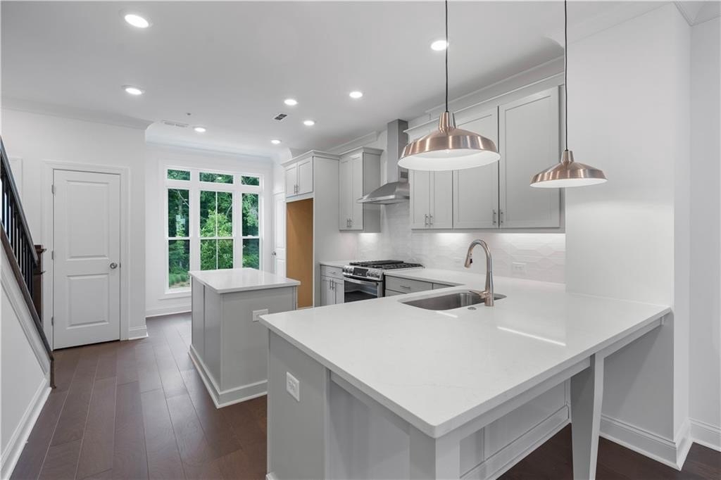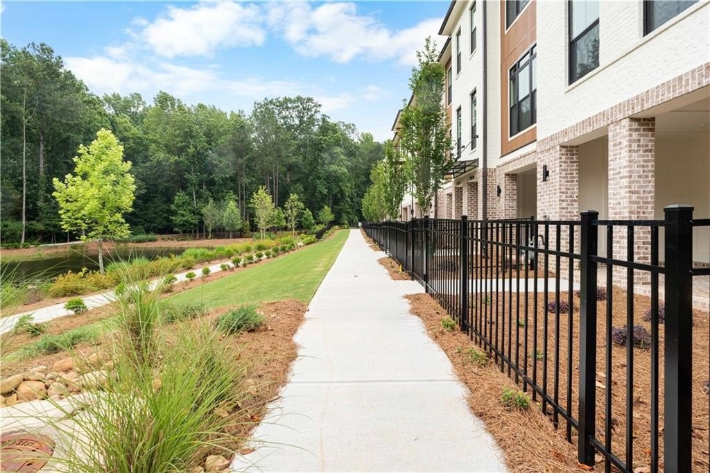 On the main level, you’ll find a bright and spacious open-concept living area, seamlessly connecting the family room, dining area, and kitchen. The kitchen is a true standout, featuring: 42" full overlay upper cabinets with soft-close doors and drawers with Elegant crown molding ~ Striking Calacatta Lavasa quartz countertops ~ Stylish tile backsplash ~ Premium GE stainless steel appliances. Upstairs, the primary suite offers a serene retreat, complete with tray ceilings, a generous walk-in closet, and a beautifully appointed en-suite bath with dual vanities and a walk-in shower. The secondary bedroom is conveniently located near the laundry closet and a well-designed private bathroom. This home combines comfort, style, and natural beauty — a perfect blend for modern living. One-car Garage with a Charger Station, extra storage space, and a driveway for an extra parking spot. Additional parking spaces can be found throughout the community. WALKABLE to endless restaurants and shopping centers, dental, medical, bank and fitness facilities and just a short trip to coveted Avalon and Downtown Alpharetta areas. The community features a landscaped wooded area, dog-friendly with pocket green spaces and offers a vibrant vibe. Great opportunity to own in Alpharetta. Virtual Tour of previously built Barnsley plan. [The Barnsley I]