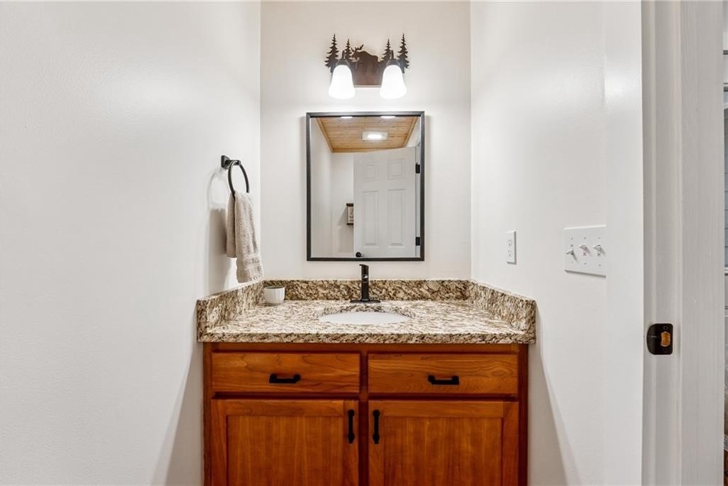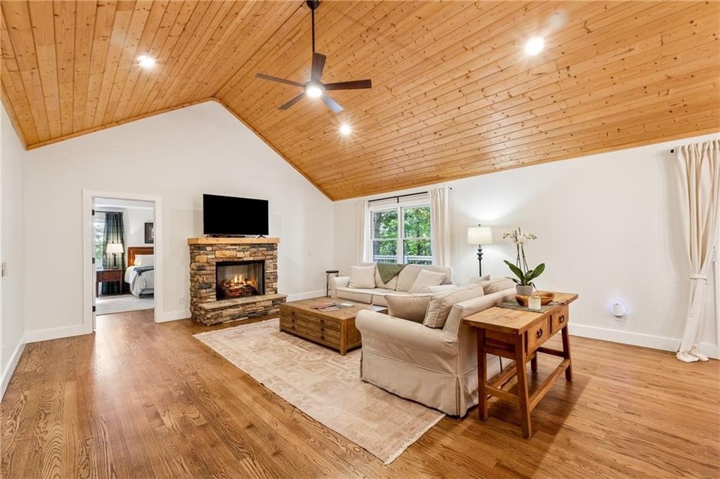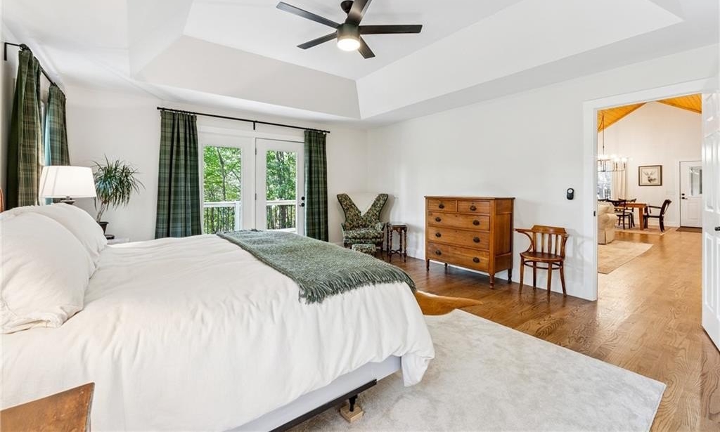 This beautifully updated mountain retreat is tucked into Big Canoe’s desirable Equestrian neighborhood, just minutes from the Main Gate. Set on a private, wooded 0.9-acre lot, the home has been extensively improved with a new roof and oversized gutters (2025), newer double garage door with level driveway access, refinished ceilings on the main level while preserving the vaulted wood in the living/dining area, exterior repainting (2024), updated plumbing throughout, and LVP flooring on the terrace level. Inside, the open living and dining area showcases soaring vaulted wood ceilings, a newly installed ventless gas log fireplace, and windows framing serene forest views. The chef’s kitchen pairs rich green cabinetry with butcher block countertops and all new stainless steel appliances (installed Dec. 2023), including a gas range. A powder room provides convenience for guests, and a well-placed laundry room offers access from both the hallway and the primary suite. The spacious primary bedroom offers a true retreat with a tray ceiling, hardwood floors, and direct access to the outdoors. The spa-like primary bath is completely renovated with a freestanding soaking tub, dual quartz-topped vanities, ample storage, and a stunning walk-in shower with designer tile and glass enclosure. Hardwood floors extend across the main level and continue down the new stairs and railings, creating a seamless flow throughout the home. The terrace level expands the living space with a comfortable den, three additional bedrooms, and a fully renovated full bath with double vanity and subway-tiled shower/tub. Flexible in design, it’s ideal for a guest suite, gym, office, or playroom, with direct walk-out access to the wooded setting.