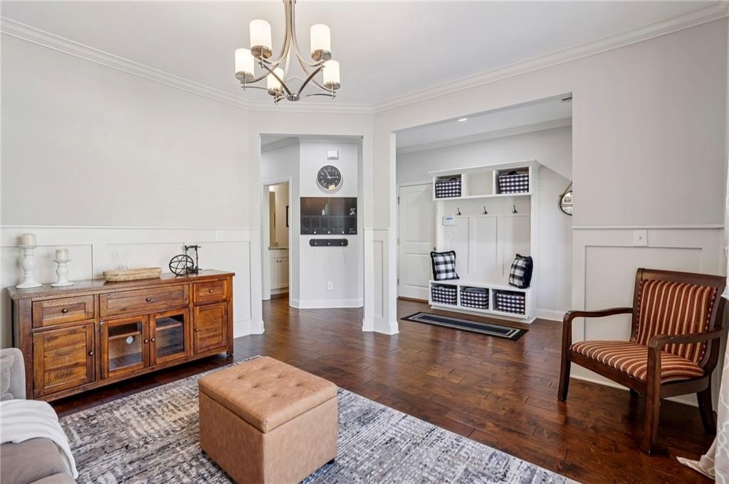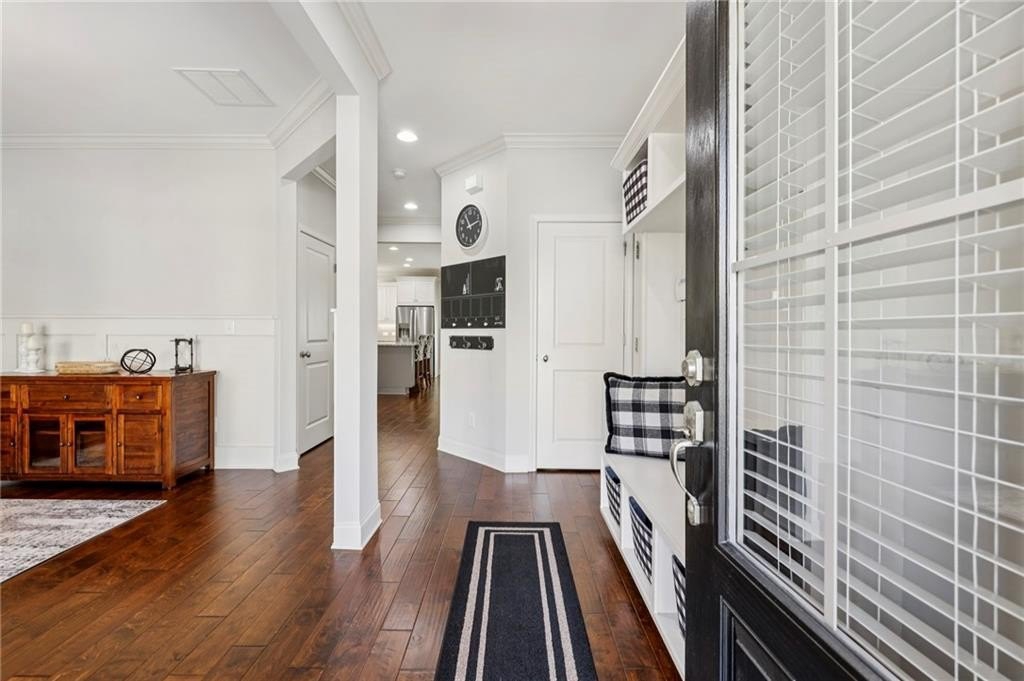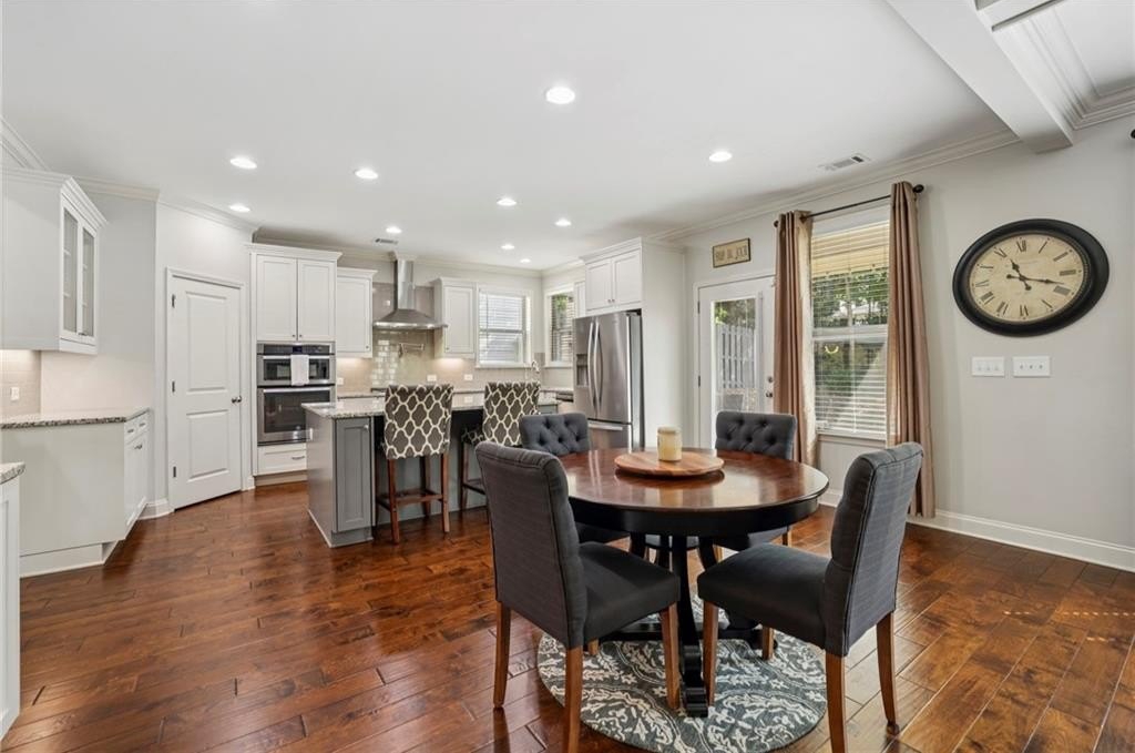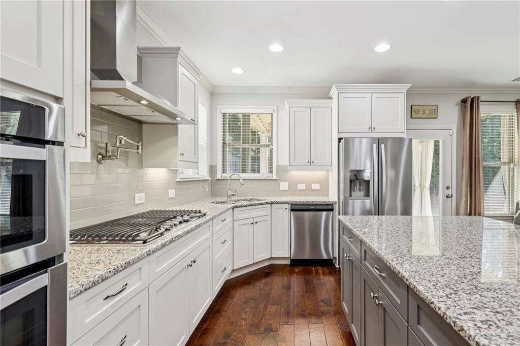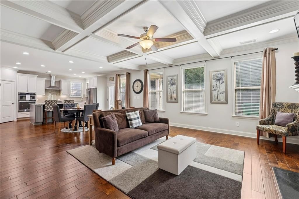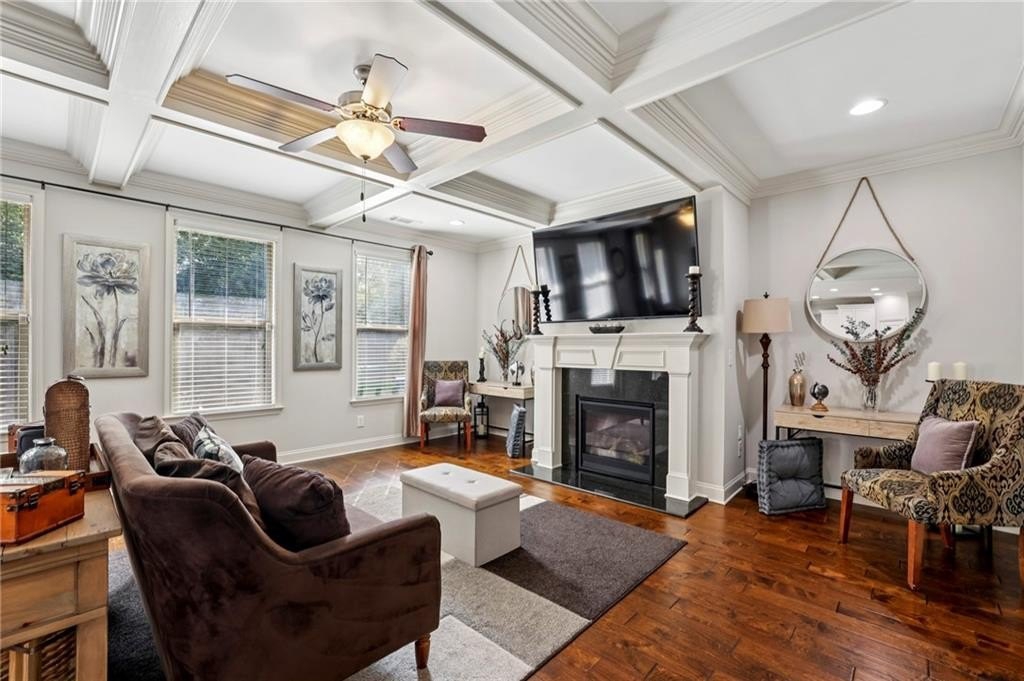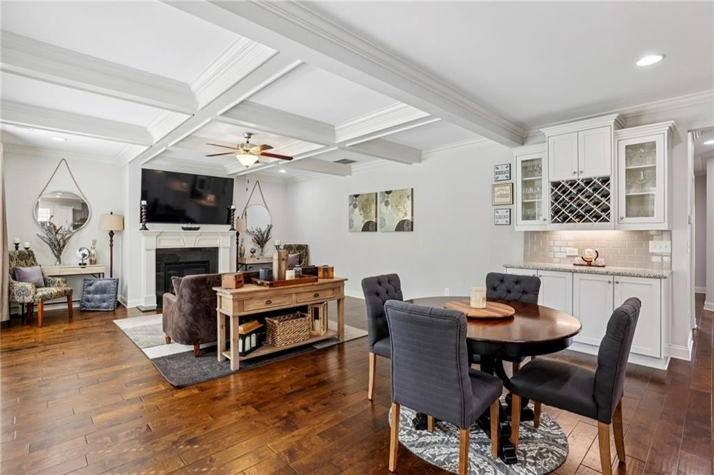 The kitchen checks every box for cooks and guests with a large island, white cabinetry, granite countertops, stainless appliances, a breakfast bar a walk-in pantry and a clear view to the family room. A separate dining room with a butler's pantry adds the right touch for holidays and dinner parties. A mud room keeps life organized on the way in from the two-car garage. The family room is rich with details like coffered ceilings and a fireplace while maintaining clean open lines for a modern look.