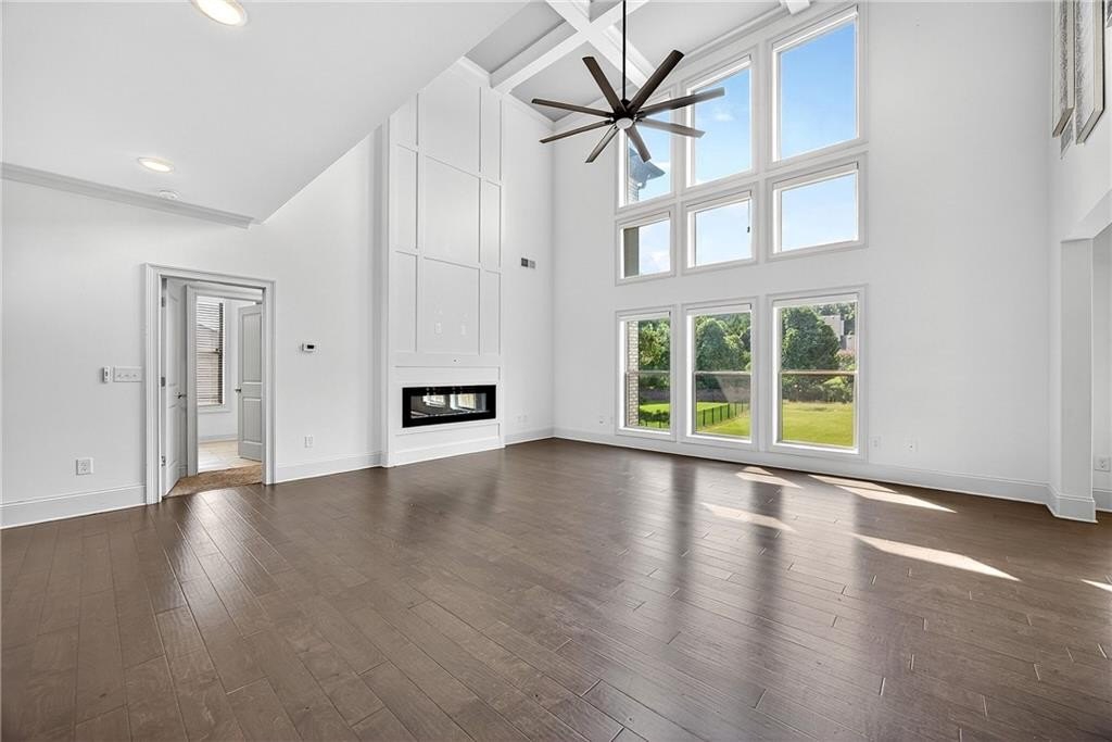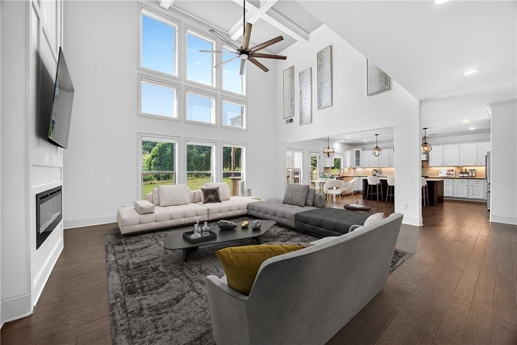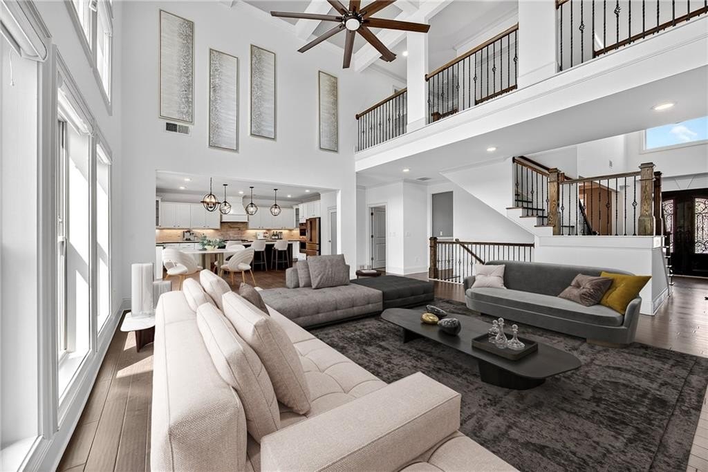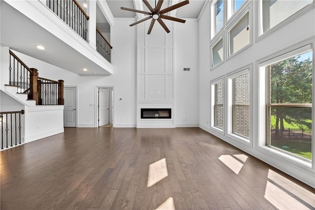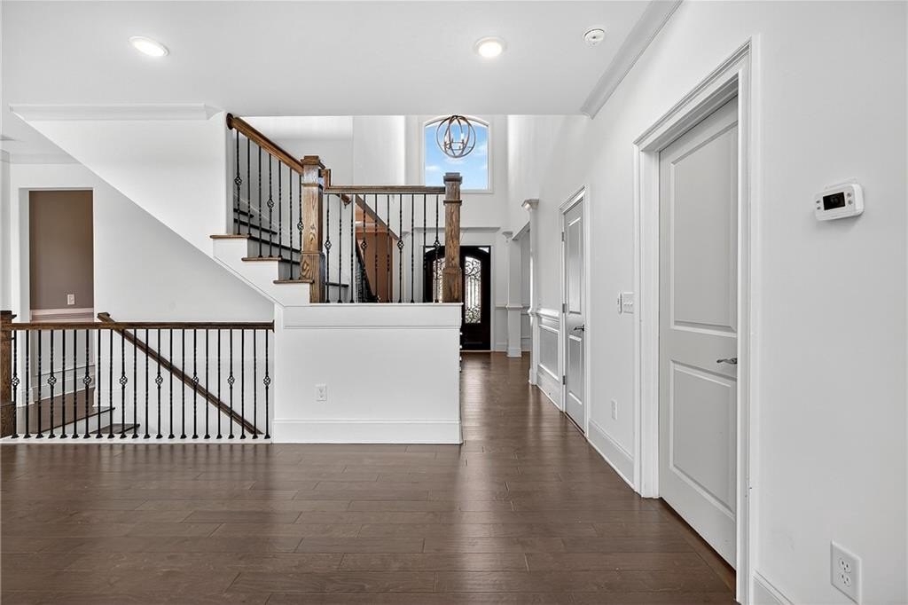 Enter through a grand, two-story foyer with rich wood flooring and elegant crown molding. The heart of this home is the breathtaking two-story family room, with soaring ceilings, a flood of natural light, and the ultimate in modern convenience: electronic blinds. With the touch of a button, you can effortlessly adjust the ambiance, privacy, and sunlight, creating an ideal space for both grand entertaining and intimate gatherings.