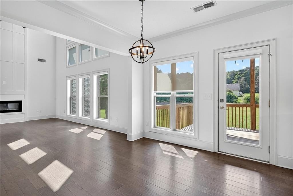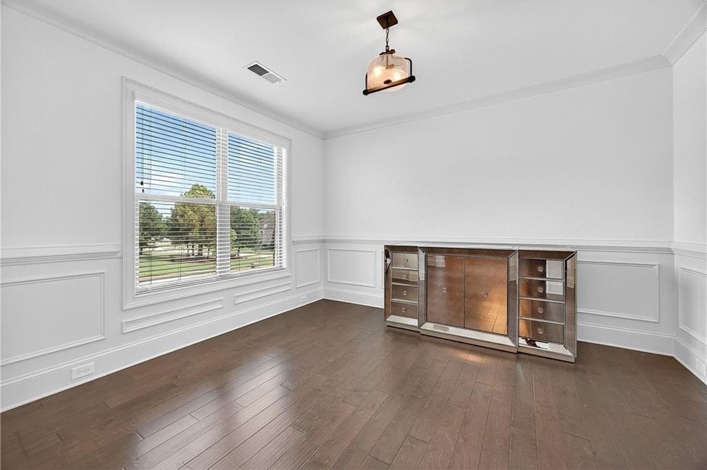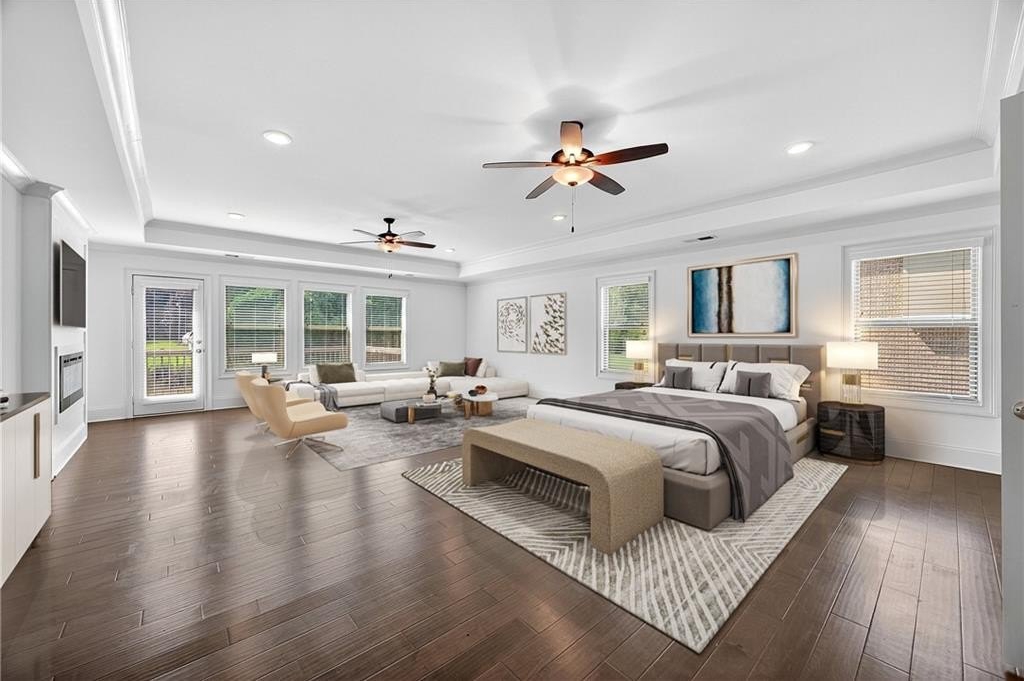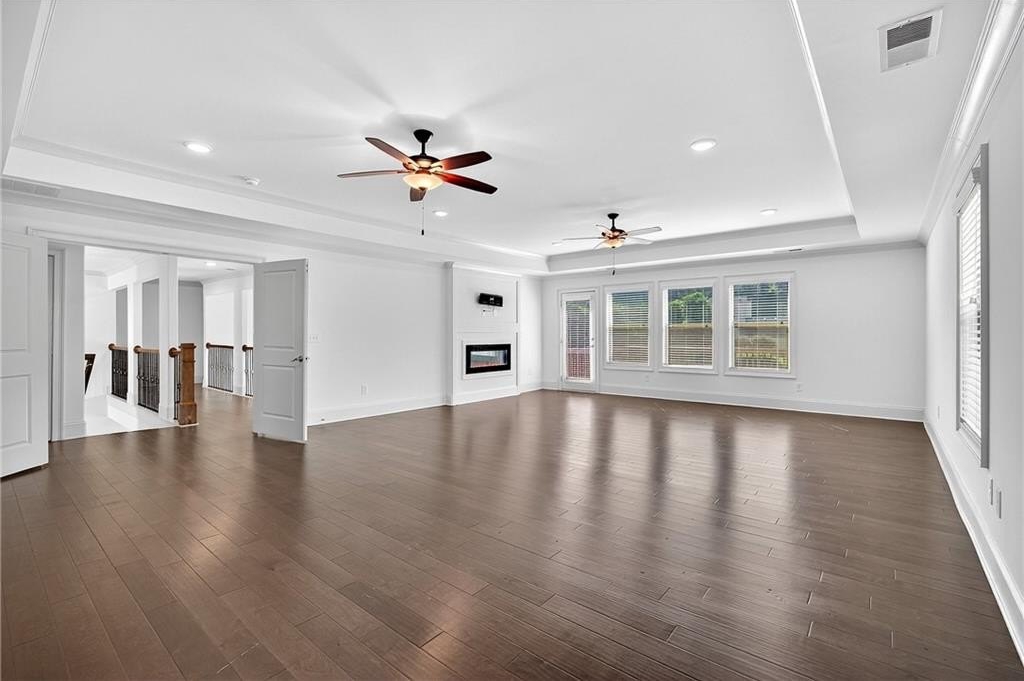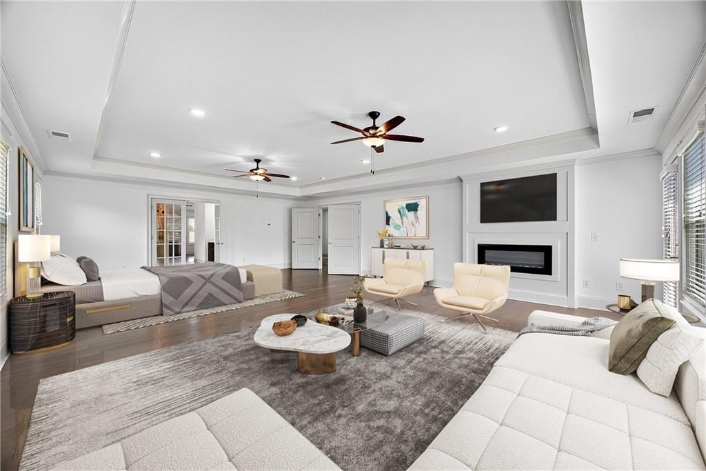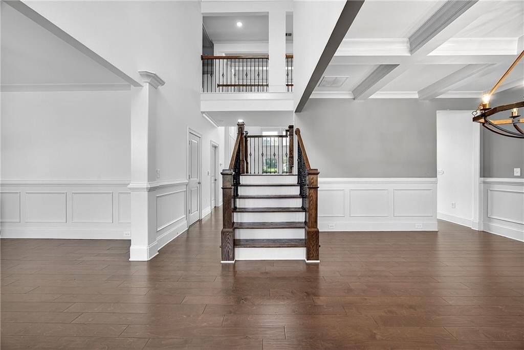 Enter through a grand, two-story foyer with rich wood flooring and elegant crown molding. The heart of this home is the breathtaking two-story family room, with soaring ceilings, a flood of natural light, and the ultimate in modern convenience: electronic blinds. With the touch of a button, you can effortlessly adjust the ambiance, privacy, and sunlight, creating an ideal space for both grand entertaining and intimate gatherings.