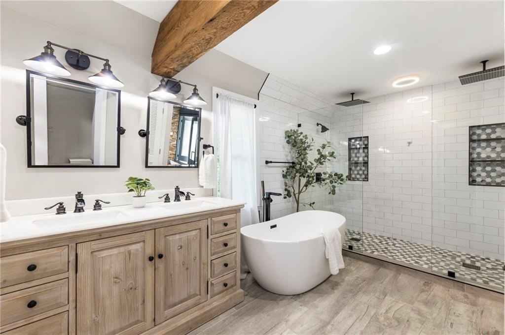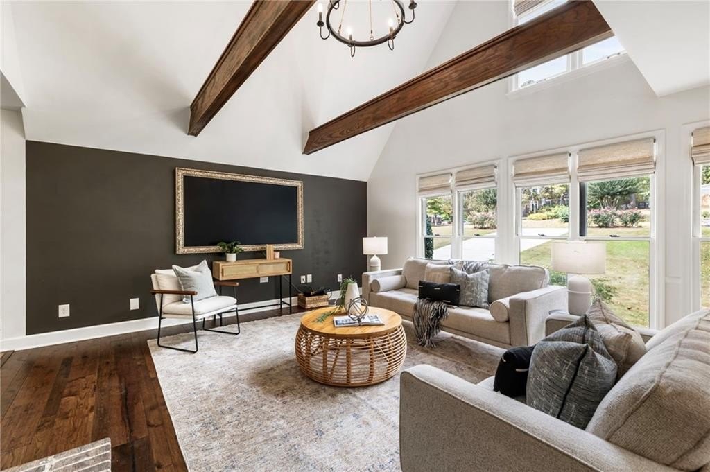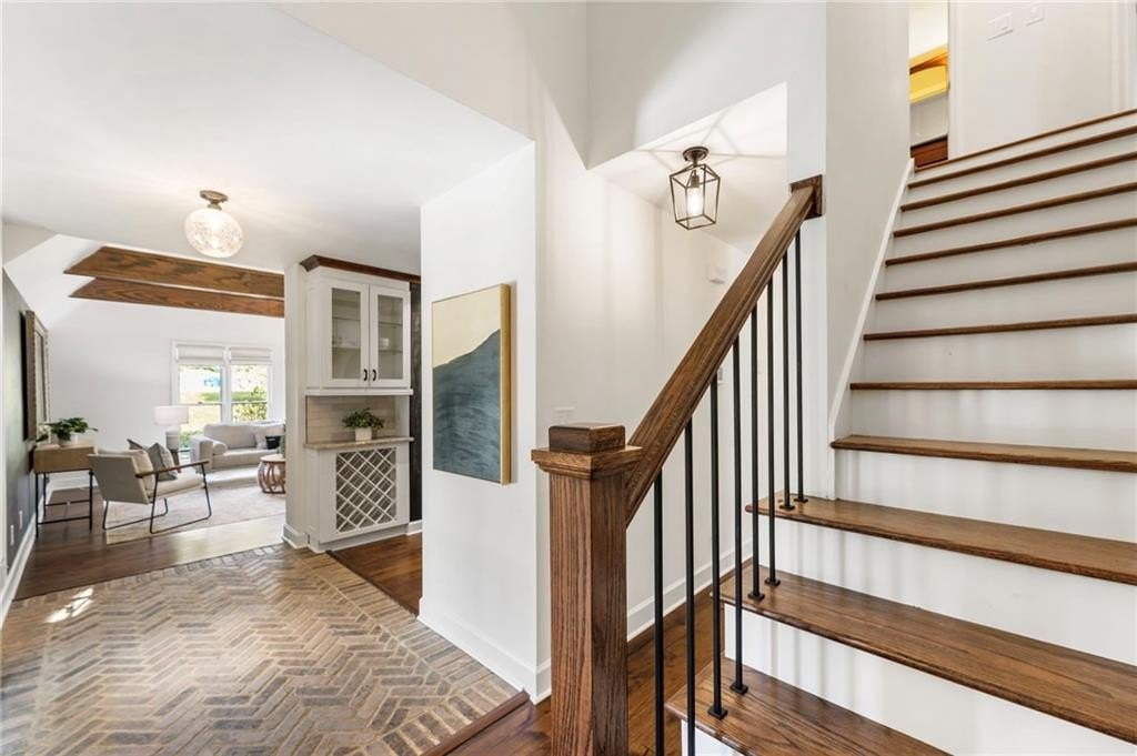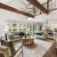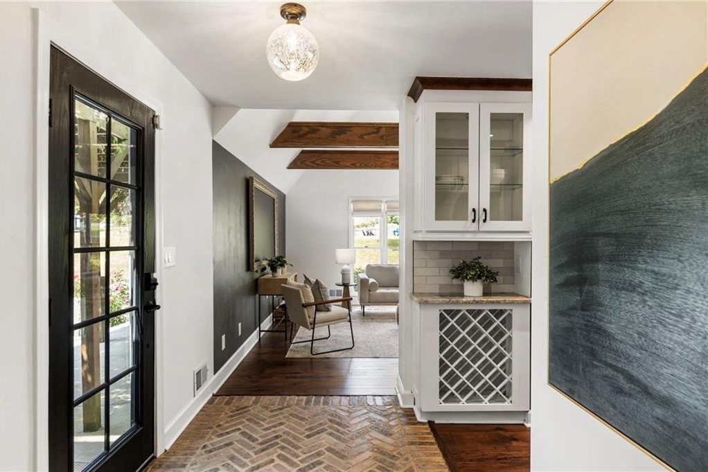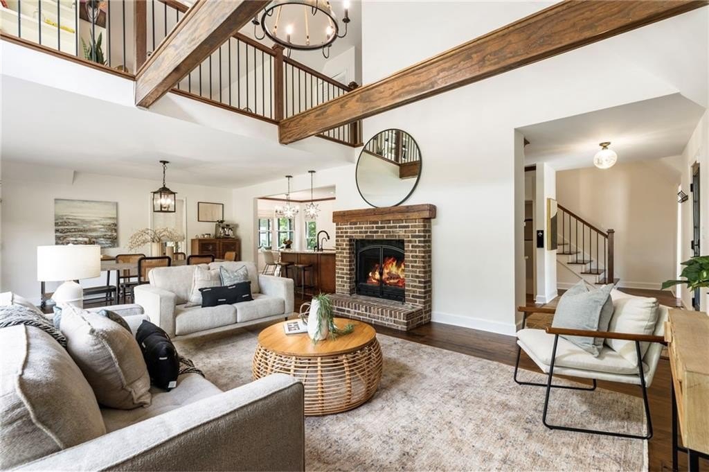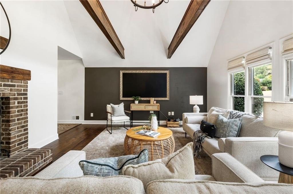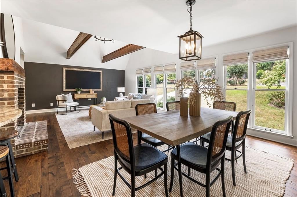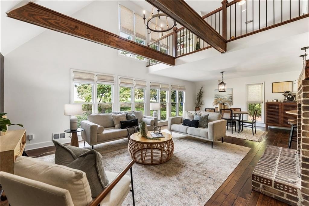 You’ll find rich hardwood floors, hand-laid brick accents, custom lighting, and timeless architectural details throughout. The great room features vaulted ceilings with exposed beams, a cozy brick fireplace, and large windows that flood the space with natural light.