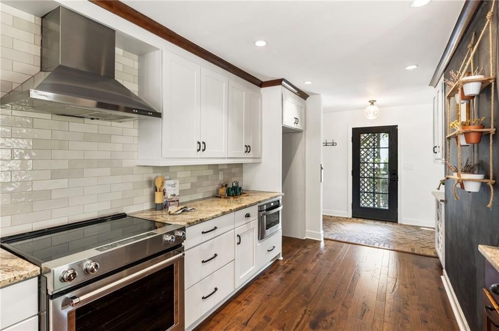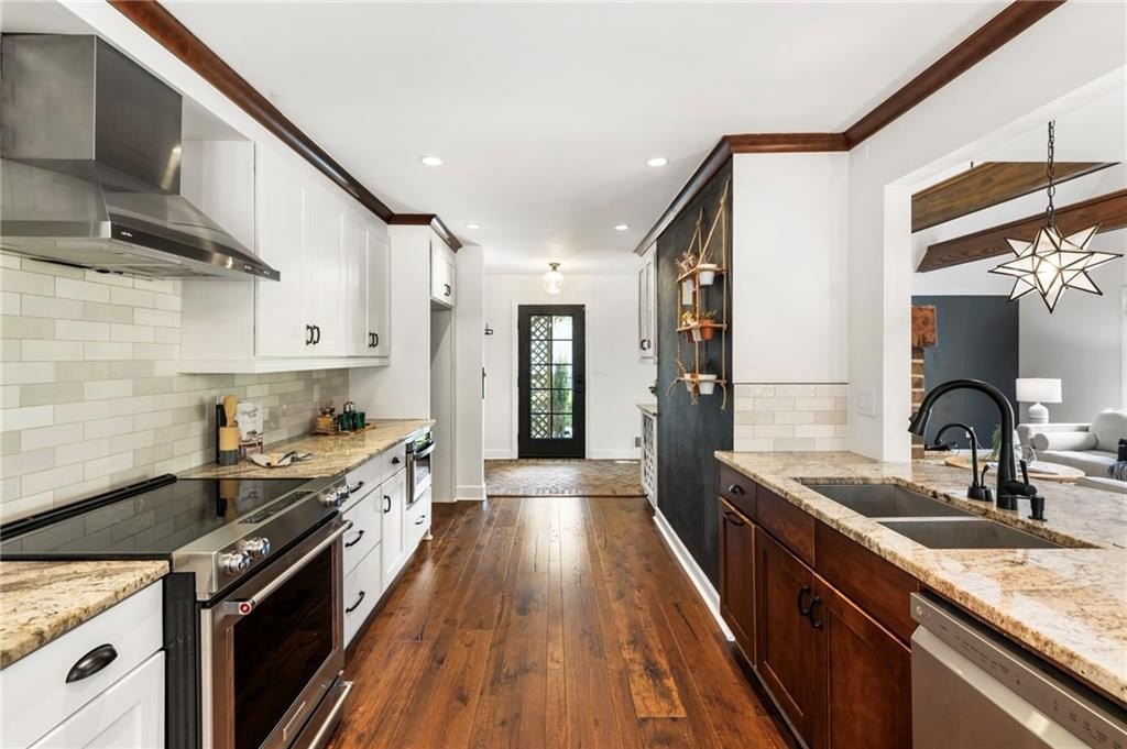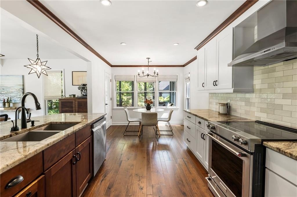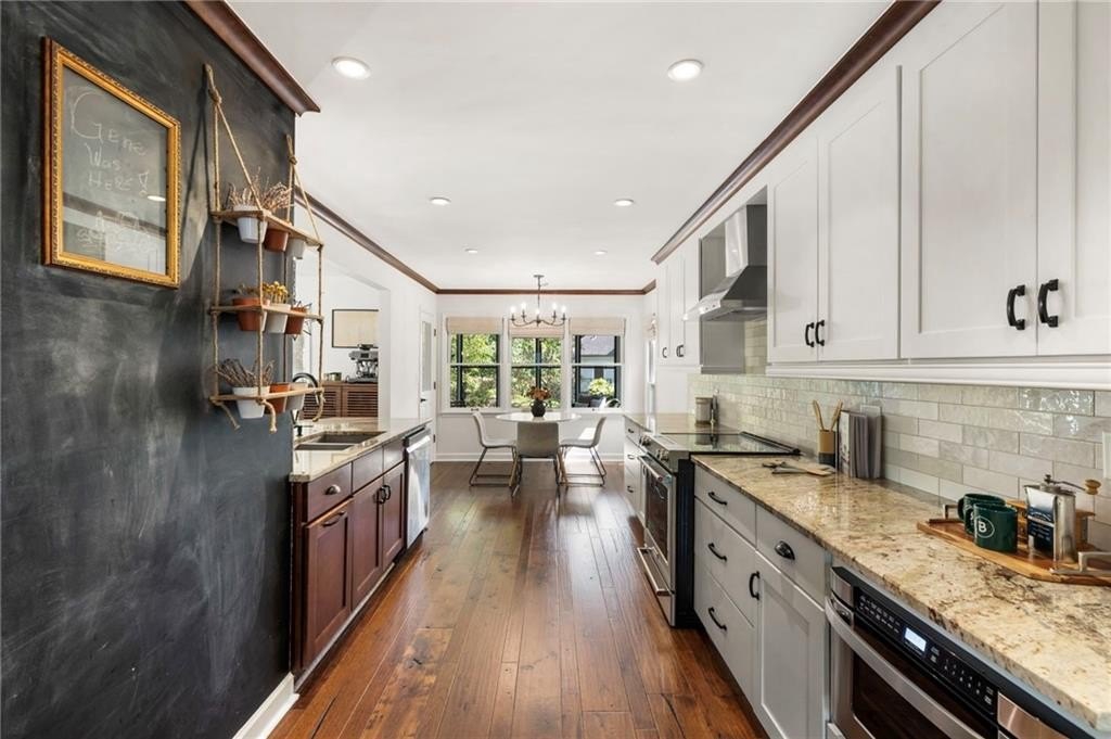 The kitchen is both stunning and functional, updated with painted cabinetry, a designer backsplash, marble countertops, stainless steel appliances including a brand-new refrigerator, and polished finishes that make the space feel fresh and completely move-in ready. It opens seamlessly to the dining room and sunroom for easy entertaining and everyday living.