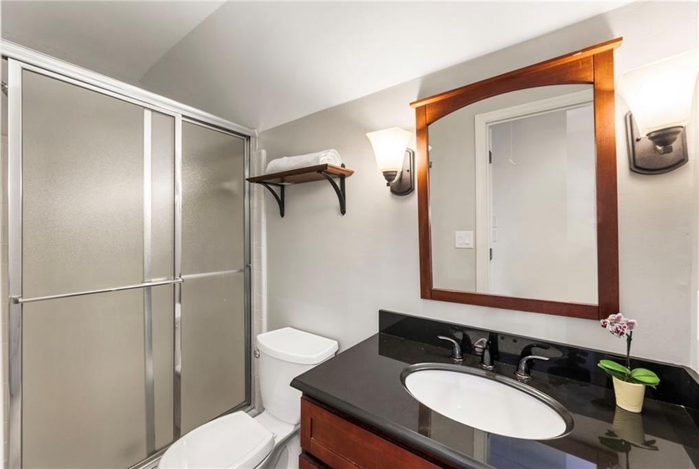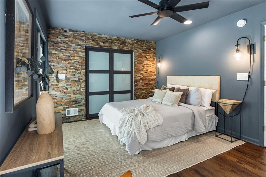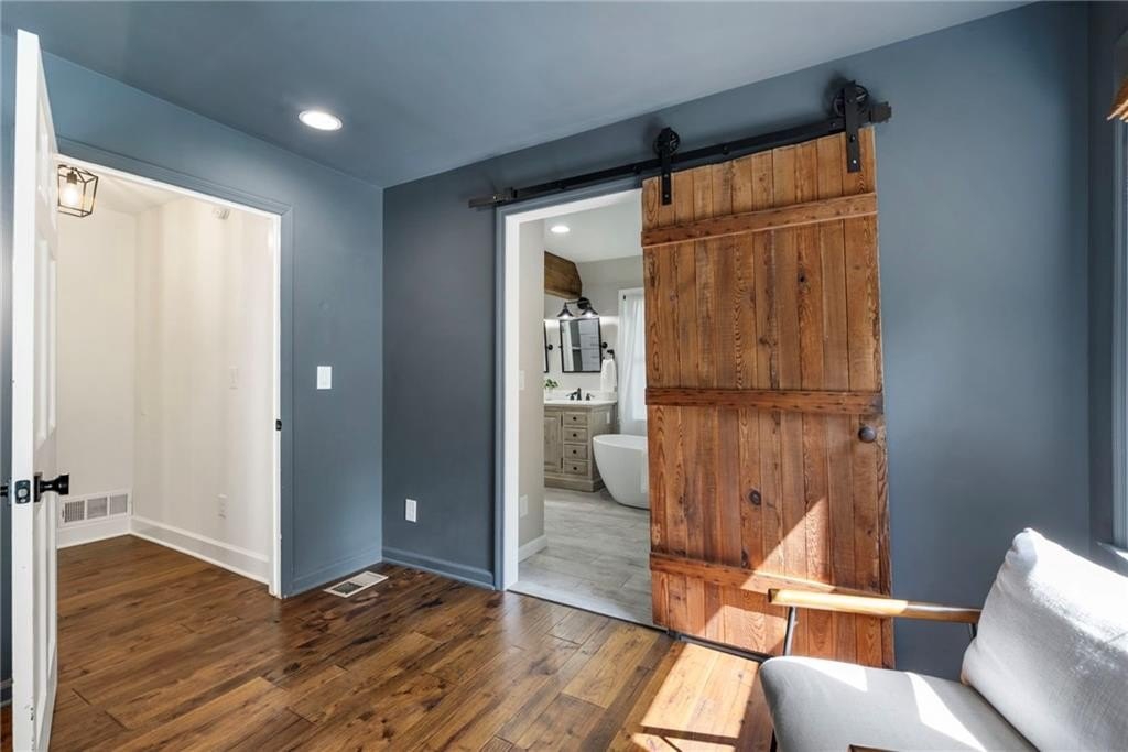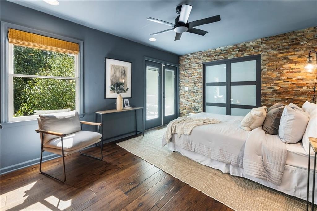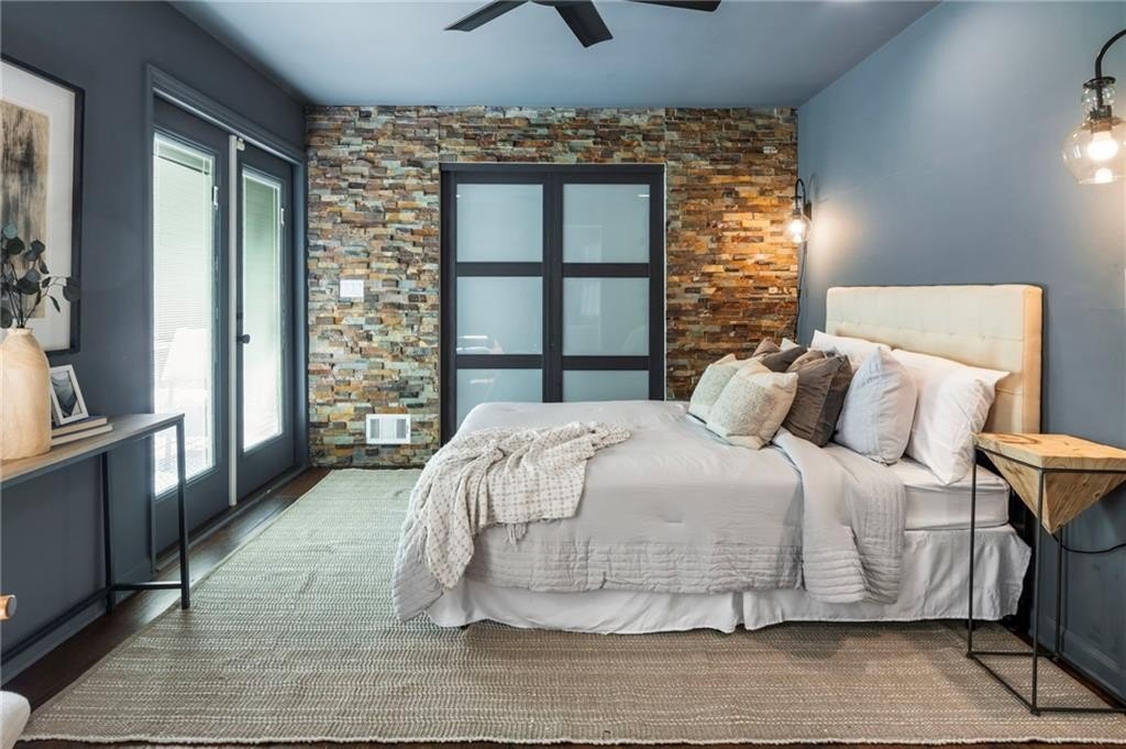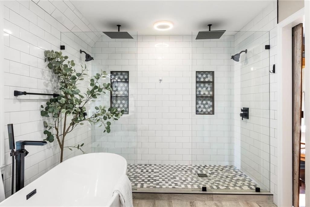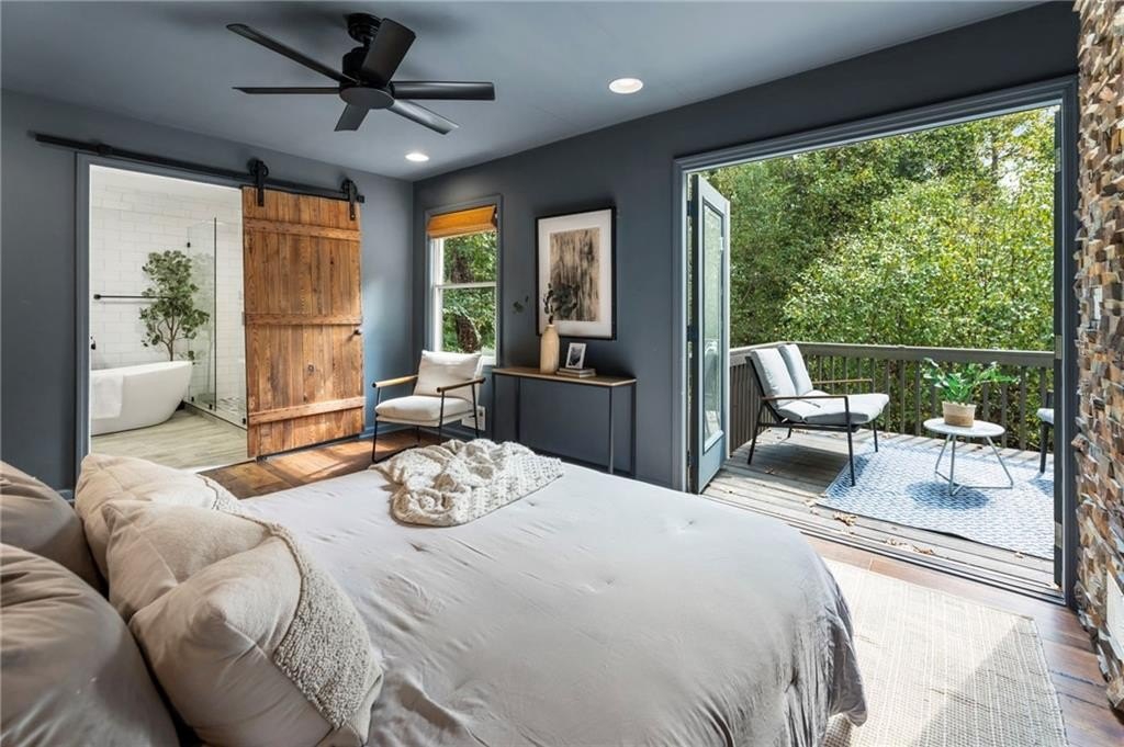 The main-level primary suite offers quiet luxury with a stone accent wall, a spa-inspired bath, and direct access to the spacious back deck, where mature trees, blooming flowers, and fruit-bearing plants create a serene escape. You’ll find blueberry bushes, peach trees, and a pear tree in the fully fenced, private backyard.