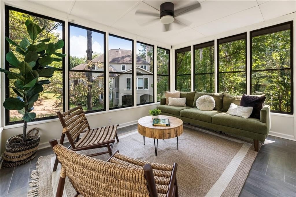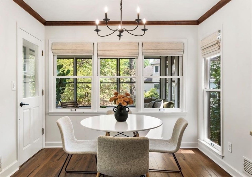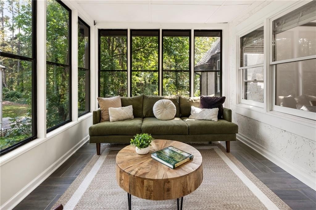 The bright sunroom sits off the side of the kitchen, an ideal spot to start your day, work remotely, or relax with peaceful views.