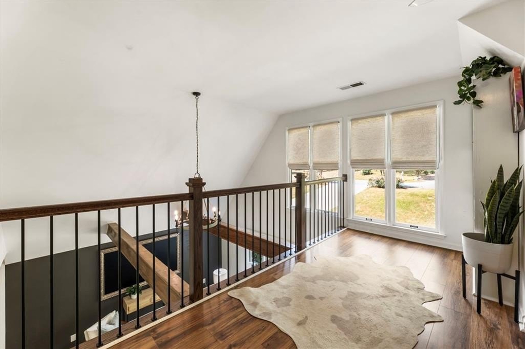 A vine-covered arbor and welcoming front porch set the tone for what’s inside. Step through the front door into a central foyer that flows easily into the spacious great room, fully updated kitchen, upstairs living area, and private main-level primary suite.