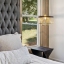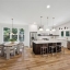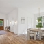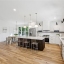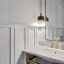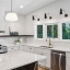 The kitchen makes a sophisticated statement with white cabinetry, dark floating shelves, and brushed-gold hardware. A generous quartz island with subtle gold veining anchors the space, complemented by sculptural pendant lighting and stainless steel appliances — ideal for both everyday living and entertaining.