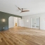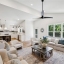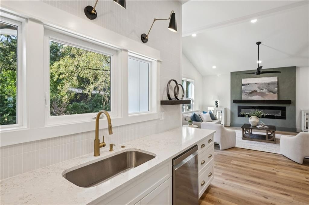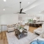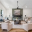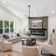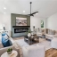 Connected seamlessly to the dining and living areas, the great room features a sleek modern fireplace set against a dramatic accent wall and soaring ceilings that amplify light and volume.