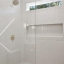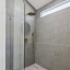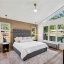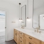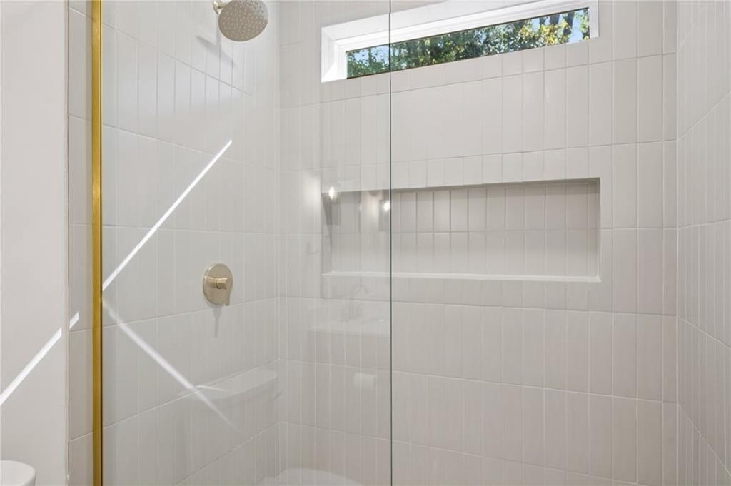 The primary suite feels like a true escape, with airy ceiling height and a spa-inspired bathroom featuring a floating dual vanity with elegant gold fixtures, amber glass sconces, and a walk-in shower lined in sage-green tile with a sleek rain shower head.