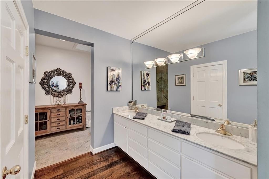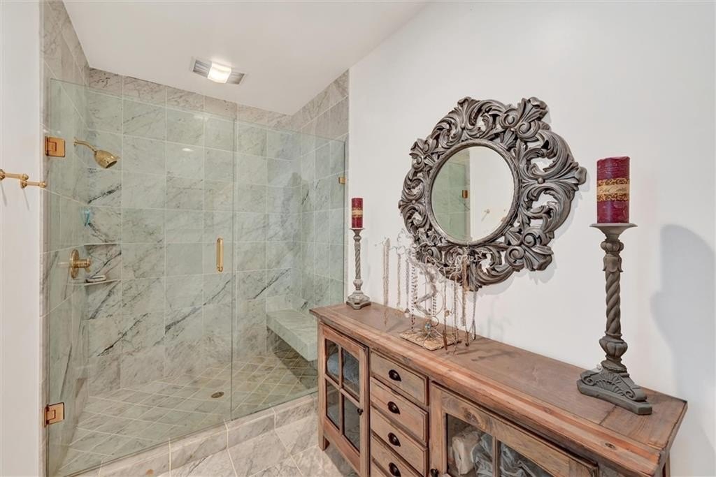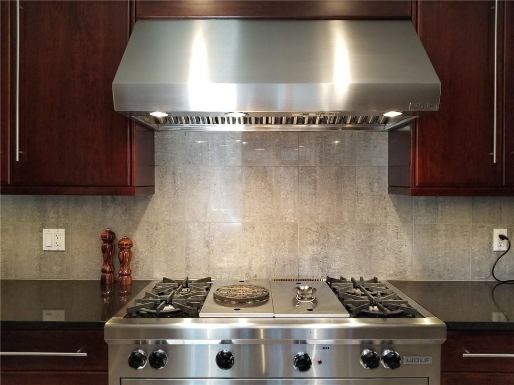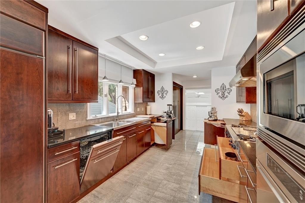 “Chef’s kitchen” perfectly describes the custom designed eat-in kitchen. Top-tier features include a tray ceiling, full-size paneled-front Sub-Zero refrigerator / freezer, Wolf cooktop with both a griddle and a grill, topped by a Wolf range hood. There’s also a Dacor wall oven / convection microwave combo, a 68” triple sink with commercial-grade faucet, triple-width window, luxurious cherry cabinetry including 2 appliance lifts, endless granite counter space, and a walk-in pantry. All the proper tools to excite the most discerning gourmand.
