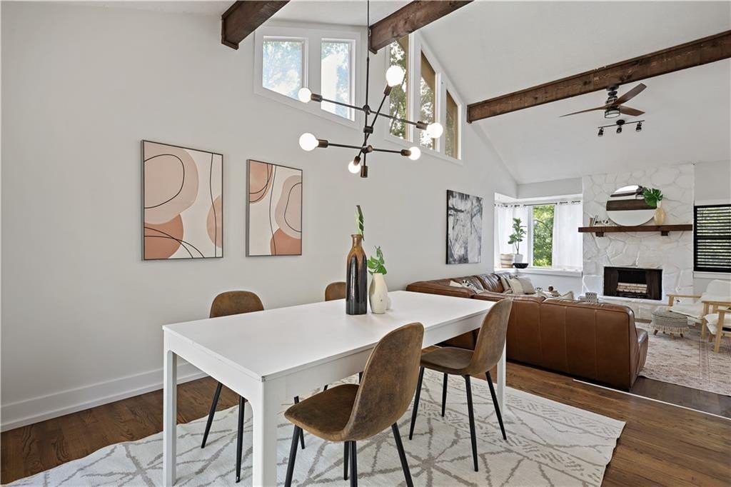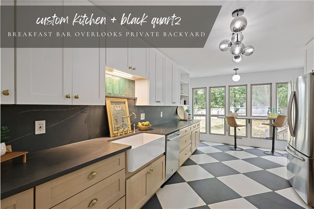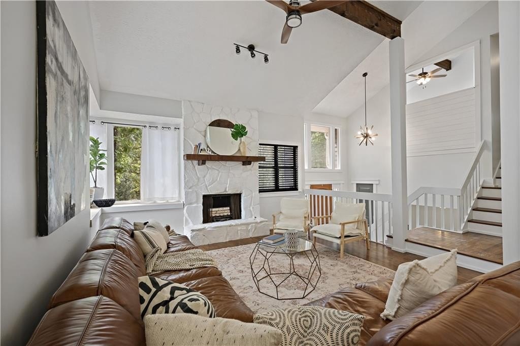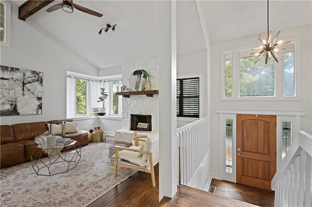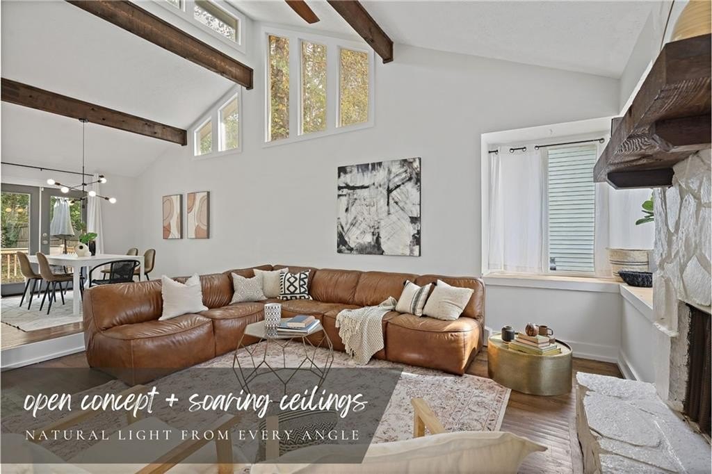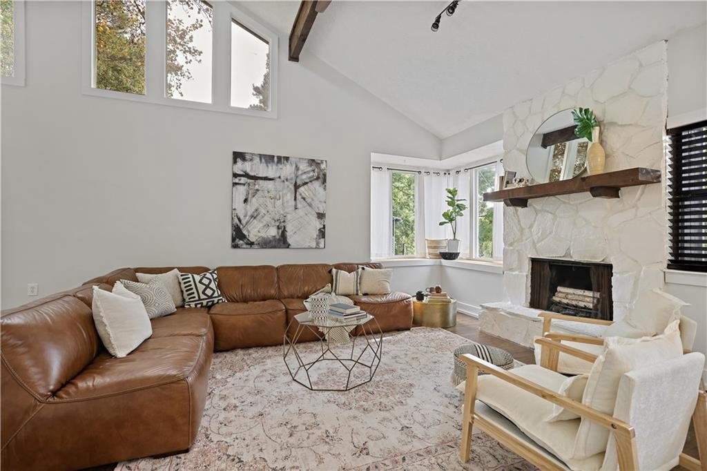 Step inside a home where light meets intention. This contemporary split-level welcomes you with soaring cathedral ceilings, exposed wood beams, and clerestory windows that bathe the interior in natural light. The custom kitchen drew a professional pastry chef to this house. He recognized what worked: warm wood lower cabinetry paired with crisp white uppers extending to the ceiling, maximizing storage while creating clean lines. Black quartz countertops and backsplash provide striking contrast, while upgraded appliances including a gas range and deep farmhouse sink make this kitchen as functional as it is beautiful. The breakfast bar overlooks the mostly private backyard, perfect for morning coffee or casual conversations while you cook. The main living spaces unfold with architectural drama. Step down into the sunken living room where vaulted ceilings with exposed beams create dramatic height, while a corner bay window frames views of mature trees and the stone fireplace anchors cozy evenings. The separate dining room flows seamlessly into this space, ideal for both intimate dinners and larger gatherings. The primary suite feels like a private retreat with vaulted ceilings and treetop window views. The renovated en suite bath features an oversized step-in shower with dual shower heads, custom niche shelving, and marble-topped double vanity. The walk-in closet offers generous storage with smart shelving systems. One of the secondary bedrooms features a converted "cloffice," a stylish nook that's perfect for remote work, creative projects, or focused study space. Step outside to discover two decks that extend your living space. Two decks extend your living space. The larger deck off the dining room works for outdoor dining, while the smaller deck off the kitchen puts you steps from your grill. The fully fenced backyard is level and tree-bordered, offering privacy and space for a future pool or garden. You'll find nearly five feet of clearance below in the encapsulated crawlspace with concrete floor provides clean, dry storage with potential for climate control. Practical peace of mind comes with a roof that's just 3 years old, fresh finishes throughout, and systems that work seamlessly together. This is a home where thoughtful design meets comfortable living, where natural light and smart layouts create spaces you'll love to inhabit. Arbor Station offers optional HOA living. You choose whether you want the resort-style amenities or prefer no HOA obligations. The amenities include two pools, tennis and pickleball courts, a clubhouse, basketball and sand volleyball courts, playgrounds, scenic walking trails, and baseball fields.