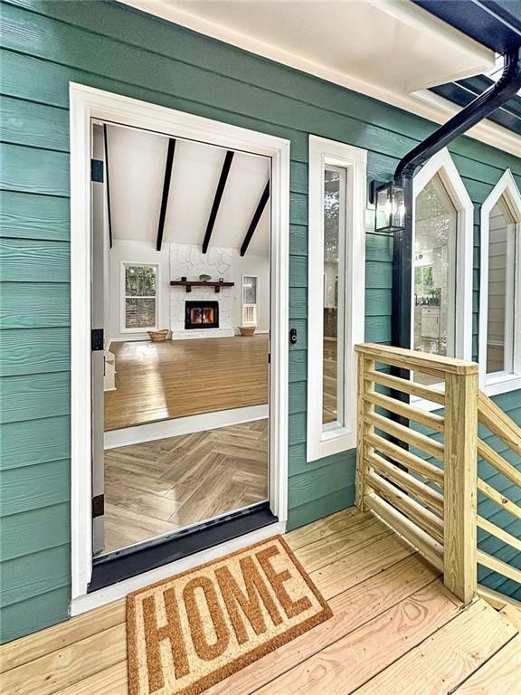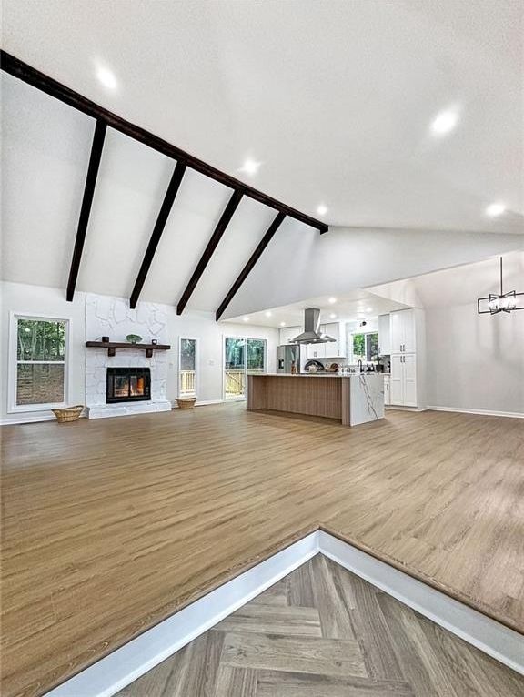 Inside, recessed LED lighting highlights wide-plank luxury vinyl flooring, herringbone tile entry, and wood ceiling beams. The chef’s kitchen features solid wood shaker soft close cabinetry, quartz countertops, antique brass hardware, an oversized waterfall island with a floating hood vent, and new Samsung stainless steel appliances.
