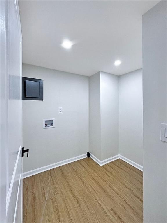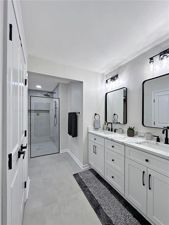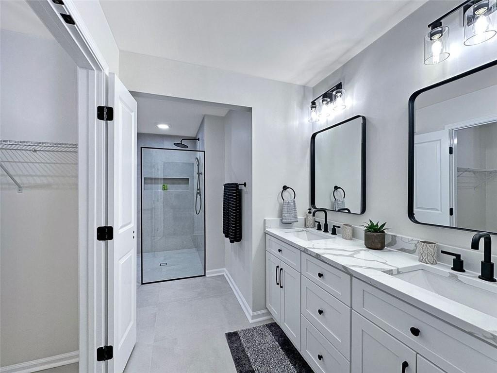 Upstairs, the primary suite offers a spa-like retreat with a curbless tiled shower, soaking tub framed by floor-to-ceiling tile, a sleek glass door, and a designer vanity. Each bathroom features modern vanities, lighting, mirrors, and upgraded tile flooring. For convenience, there are two laundry rooms—one upstairs near the bedrooms and another in the fully finished terrace level.