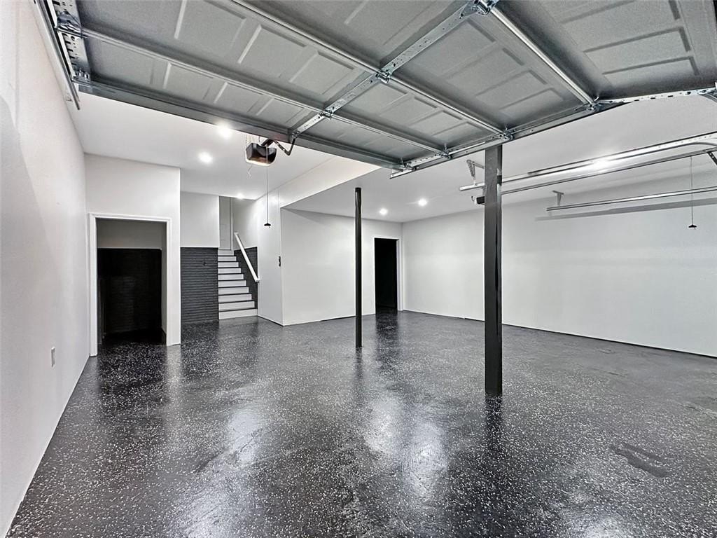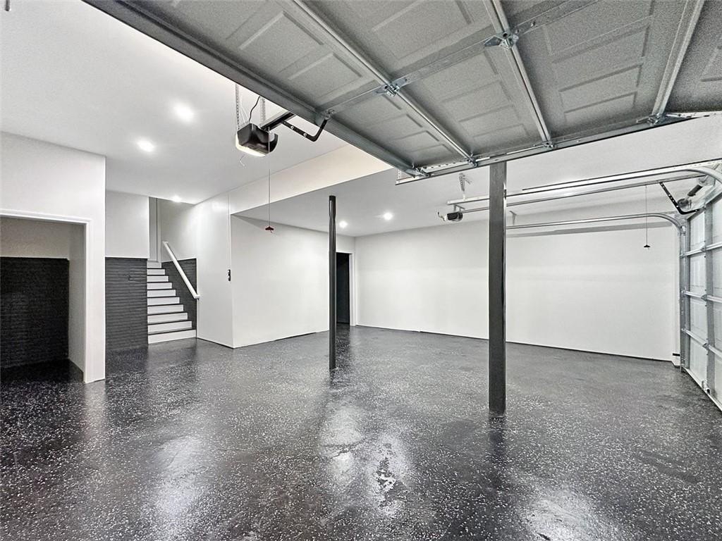 The primary suite is a spa-like retreat with a curbless tiled shower, soaking tub, designer vanity, and private deck. Bathrooms throughout the home have modern vanities, lighting, and upgraded tile. For convenience, there are two laundry rooms—one upstairs and one in the finished terrace level.