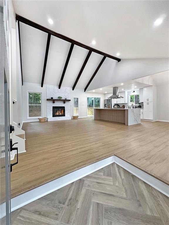 Inside, every detail has been elevated. The garage features finished drywall, showroom-style epoxy flooring, and recessed lighting. Over 100 recessed LED lights illuminate the home, highlighting the wide-plank 22 mm luxury vinyl flooring, fresh interior and exterior paint, and herringbone tile entry. New shaker-style interior doors with upgraded hardware, modern decorative switches, ceiling fans with remotes in every upstairs bedroom, and new insulation and HVAC ducts enhance comfort and style. Beautiful wood ceiling beams bring warmth and architectural character.