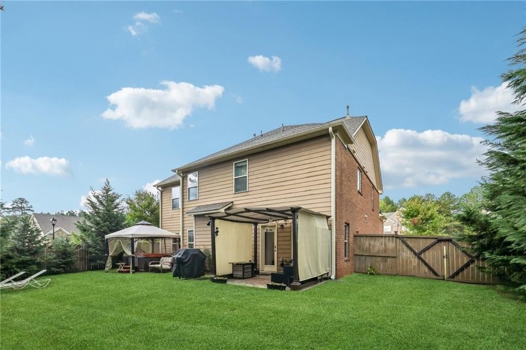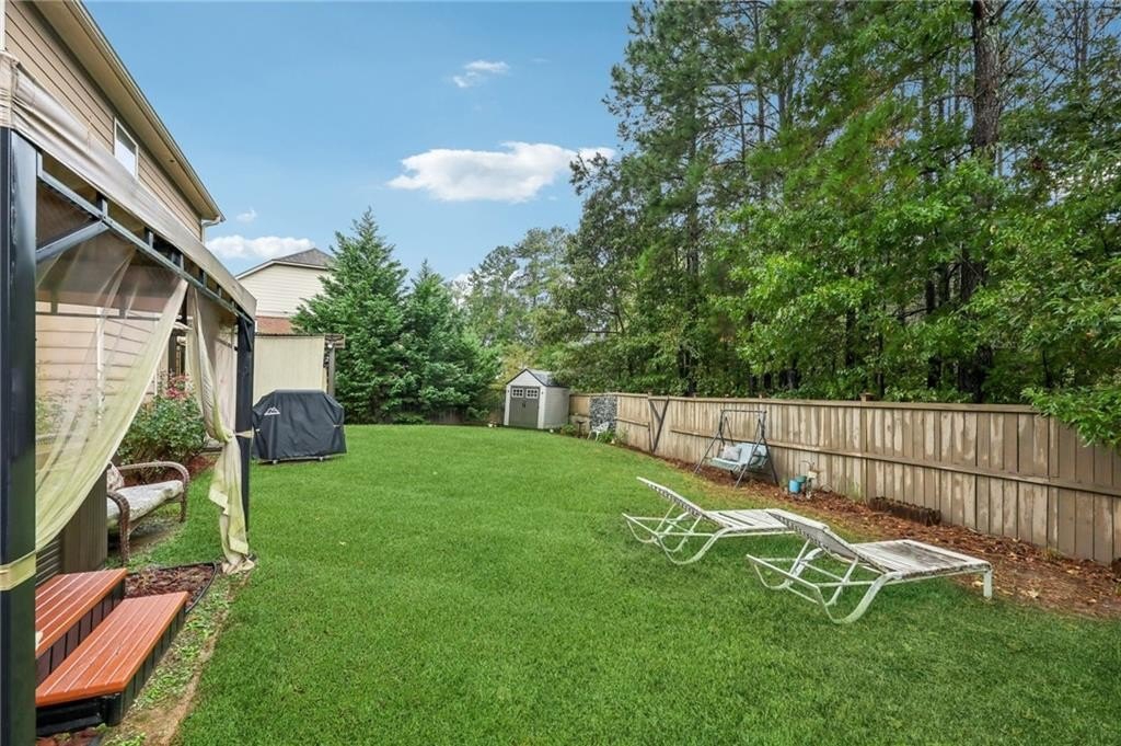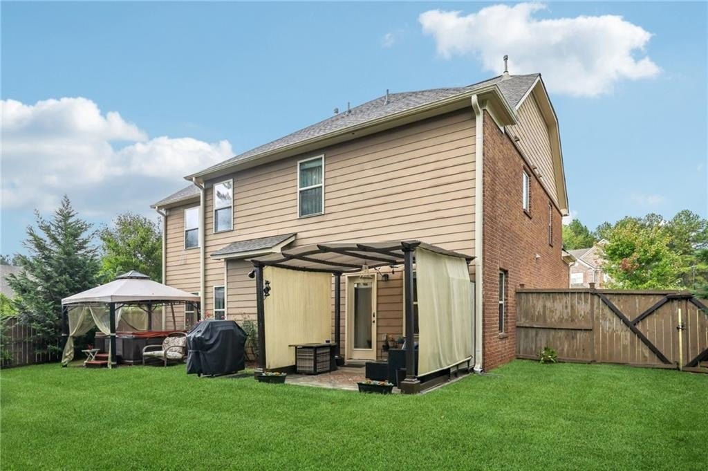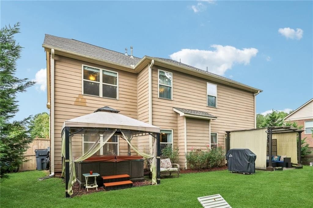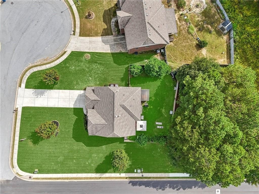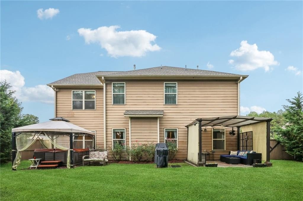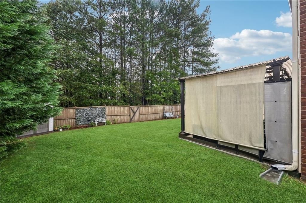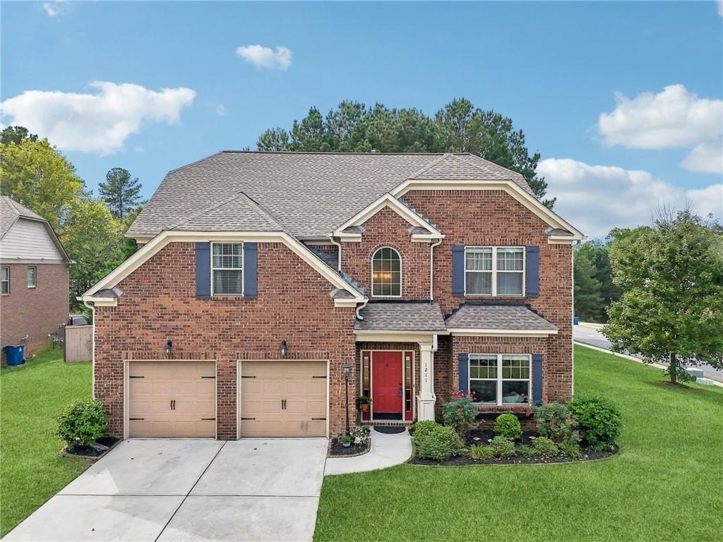 Welcome to this exceptional executive 4 bedroom, 3.5 bath residence, perfectly poised on a beautifully landscaped, level corner lot of just over an acre, with the property extending well beyond the fenced backyard for added privacy and space. A striking brick front exterior and charming curb appeal set the tone, leading into a grand 2-story foyer adorned with gleaming hardwood floors, wainscoting, decorative columns, and elegant arched doorways that create an immediate sense of sophistication. The main level offers a seamless blend of comfort and style with a formal open-concept dining room crowned by a coffered ceiling, a gracious formal living room, and a warm and inviting family room highlighted by a cozy gas log fireplace. The chef’s kitchen is a true showstopper, featuring rich cherry-stained cabinetry, gleaming granite countertops, a massive center island, stainless steel appliances, a convenient breakfast bar, and a sunlit breakfast area that overlooks the backyard oasis. Upstairs, the oversized owner’s suite is a private retreat, complete with a French door entry, elegant tray ceiling, spacious walk-in closet, and a luxurious spa-inspired bath with double vanities, a soaking tub, and a separate shower. Secondary bedrooms are impressively large, each with tray ceilings, including a private guest suite with its own bath and walk-in closet—perfect for family or visitors. Thoughtful upgrades abound, including crown molding, recessed lighting, plantation shutters, and smart home features that add modern convenience to timeless design. Step outside to discover an entertainer’s dream backyard, complete with a pergola, gazebo, covered patio, and enchanting solar lighting, all framed by a fenced yard that still leaves room to roam. The 2-car garage is fully insulated with storage space and dual openers, and peace of mind comes with a roof that is only 5 years old.