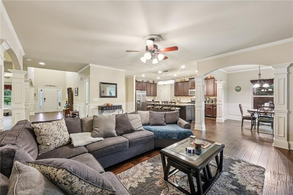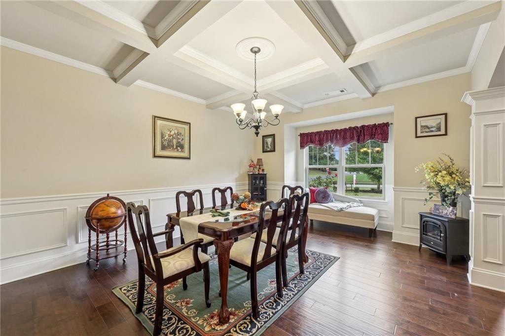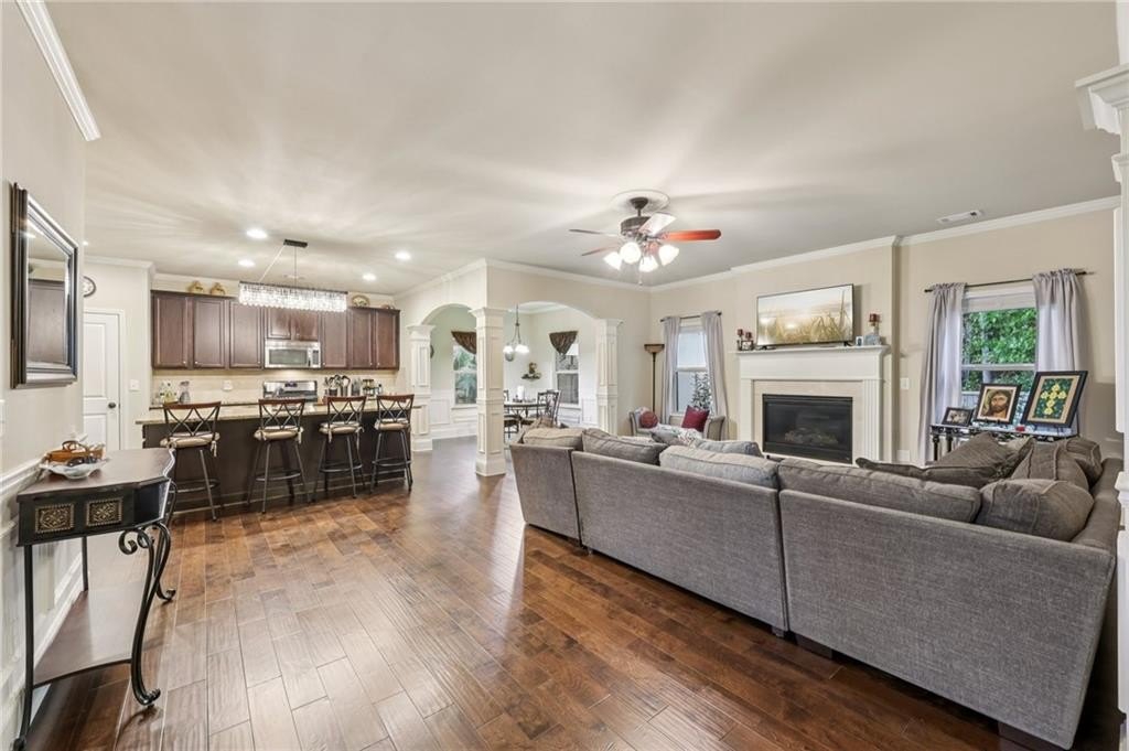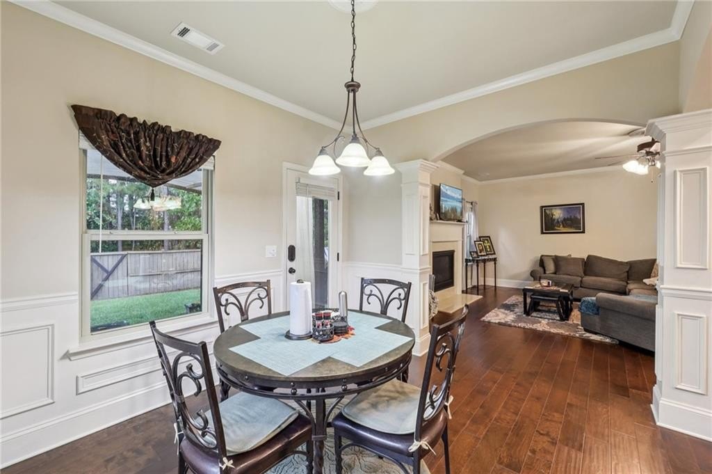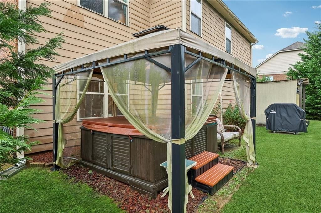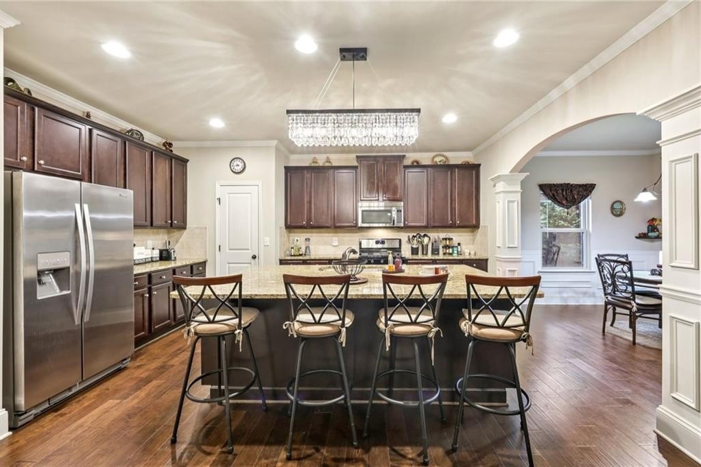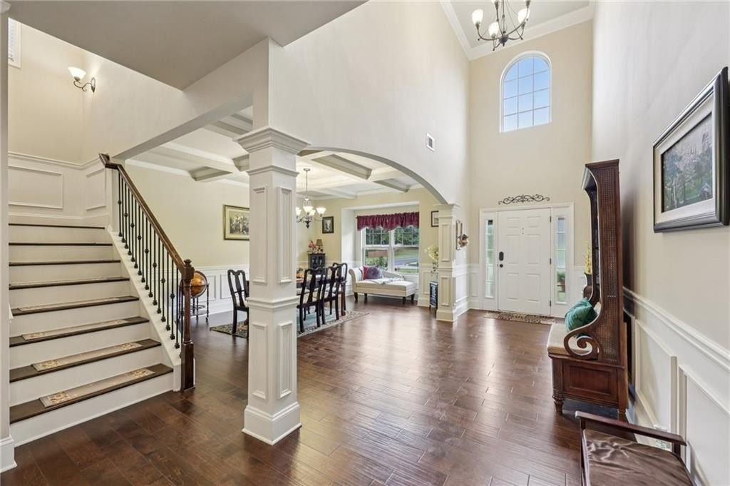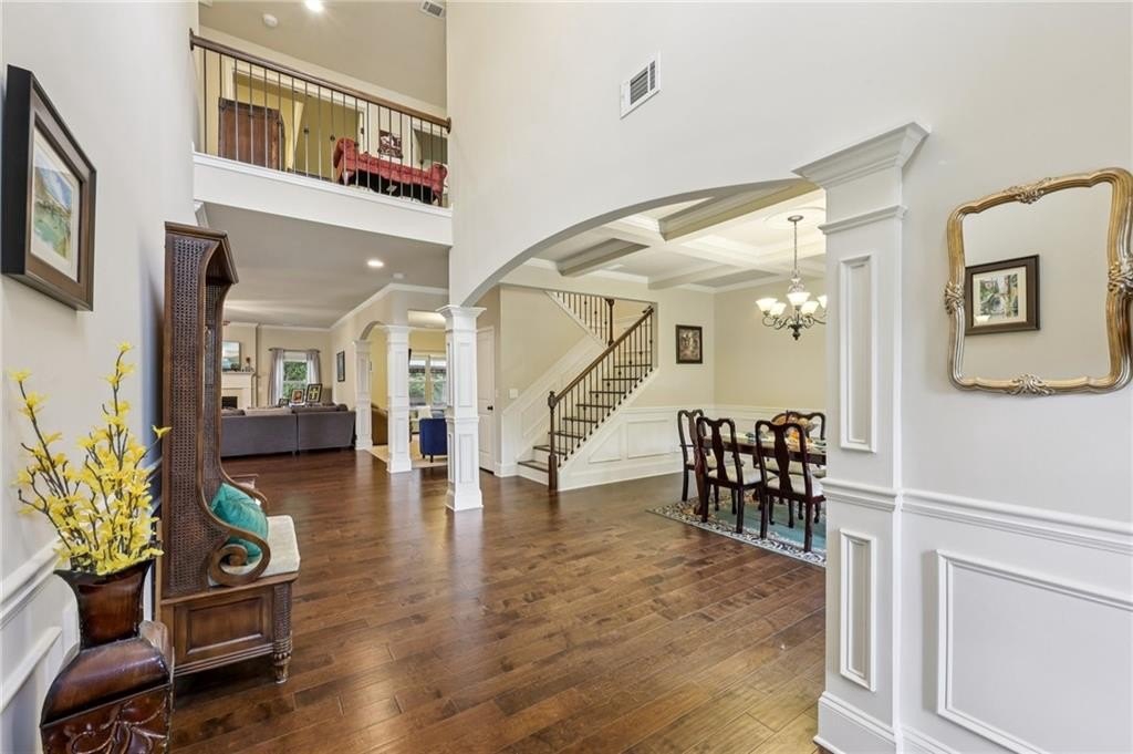 Welcome to this exceptional executive 4 bedroom, 3.5 bath residence, perfectly poised on a beautifully landscaped, level corner lot of just over an acre, with the property extending well beyond the fenced backyard for added privacy and space. A striking brick front exterior and charming curb appeal set the tone, leading into a grand 2-story foyer adorned with gleaming hardwood floors, wainscoting, decorative columns, and elegant arched doorways that create an immediate sense of sophistication. The main level offers a seamless blend of comfort and style with a formal open-concept dining room crowned by a coffered ceiling, a gracious formal living room, and a warm and inviting family room highlighted by a cozy gas log fireplace. The chef’s kitchen is a true showstopper, featuring rich cherry-stained cabinetry, gleaming granite countertops, a massive center island, stainless steel appliances, a convenient breakfast bar, and a sunlit breakfast area that overlooks the backyard oasis. Upstairs, the oversized owner’s suite is a private retreat, complete with a French door entry, elegant tray ceiling, spacious walk-in closet, and a luxurious spa-inspired bath with double vanities, a soaking tub, and a separate shower. Secondary bedrooms are impressively large, each with tray ceilings, including a private guest suite with its own bath and walk-in closet—perfect for family or visitors. Thoughtful upgrades abound, including crown molding, recessed lighting, plantation shutters, and smart home features that add modern convenience to timeless design. Step outside to discover an entertainer’s dream backyard, complete with a pergola, gazebo, covered patio, and enchanting solar lighting, all framed by a fenced yard that still leaves room to roam. The 2-car garage is fully insulated with storage space and dual openers, and peace of mind comes with a roof that is only 5 years old.