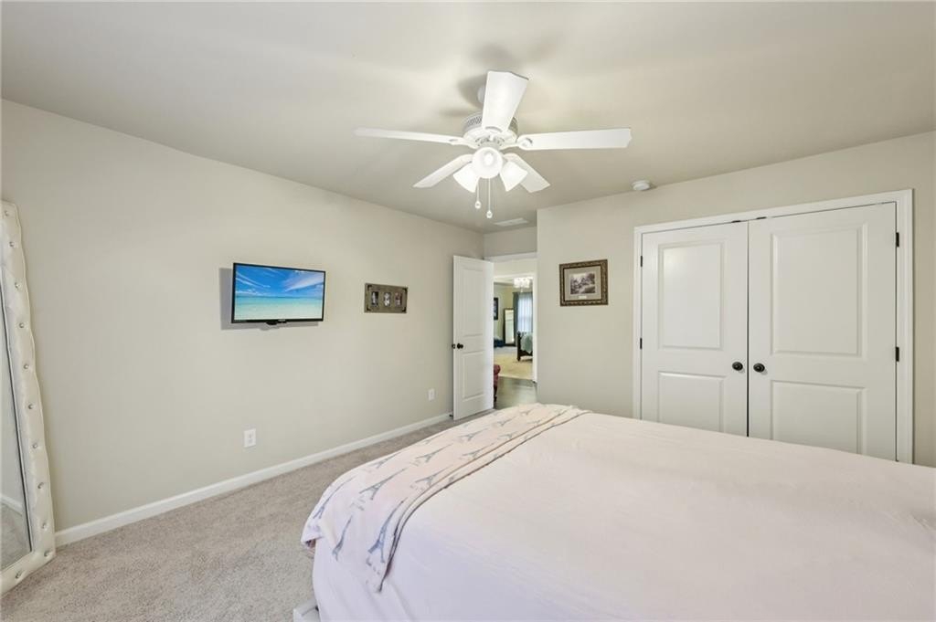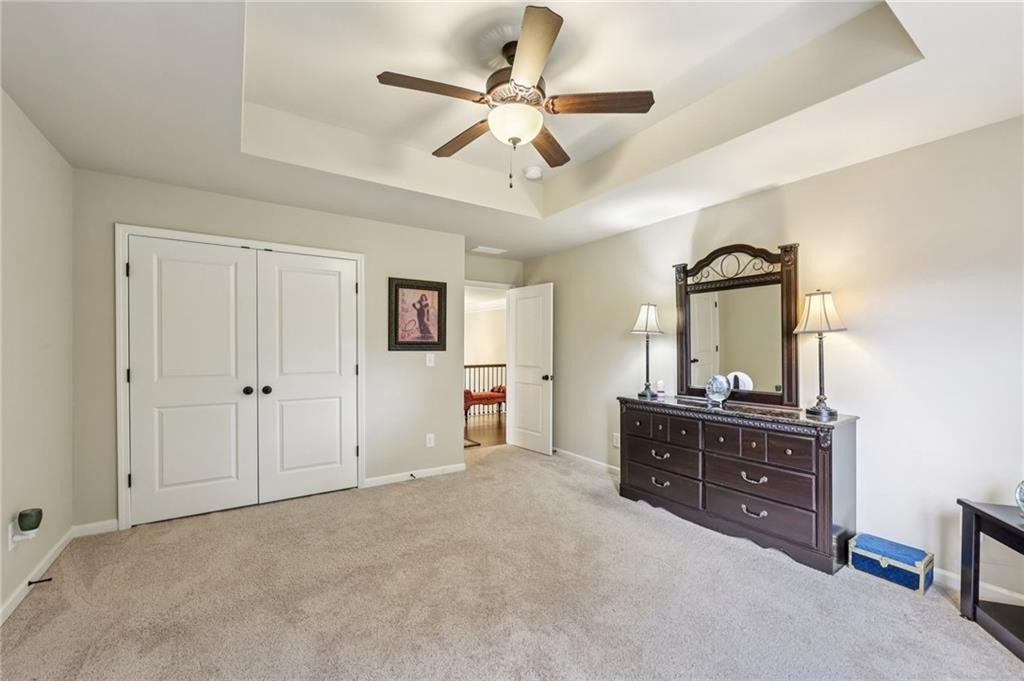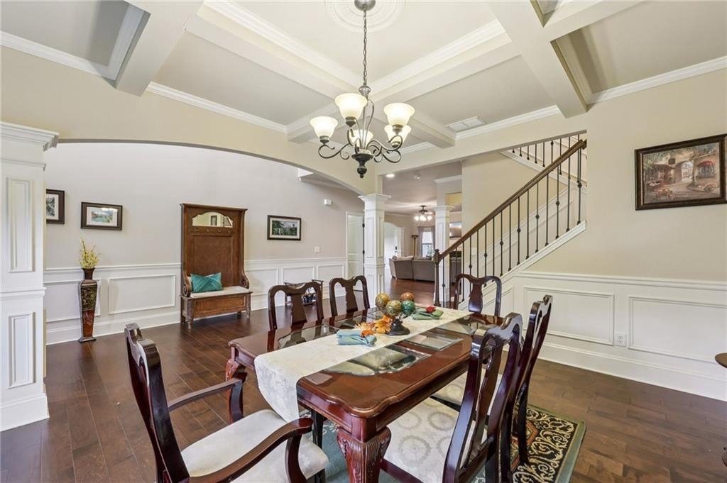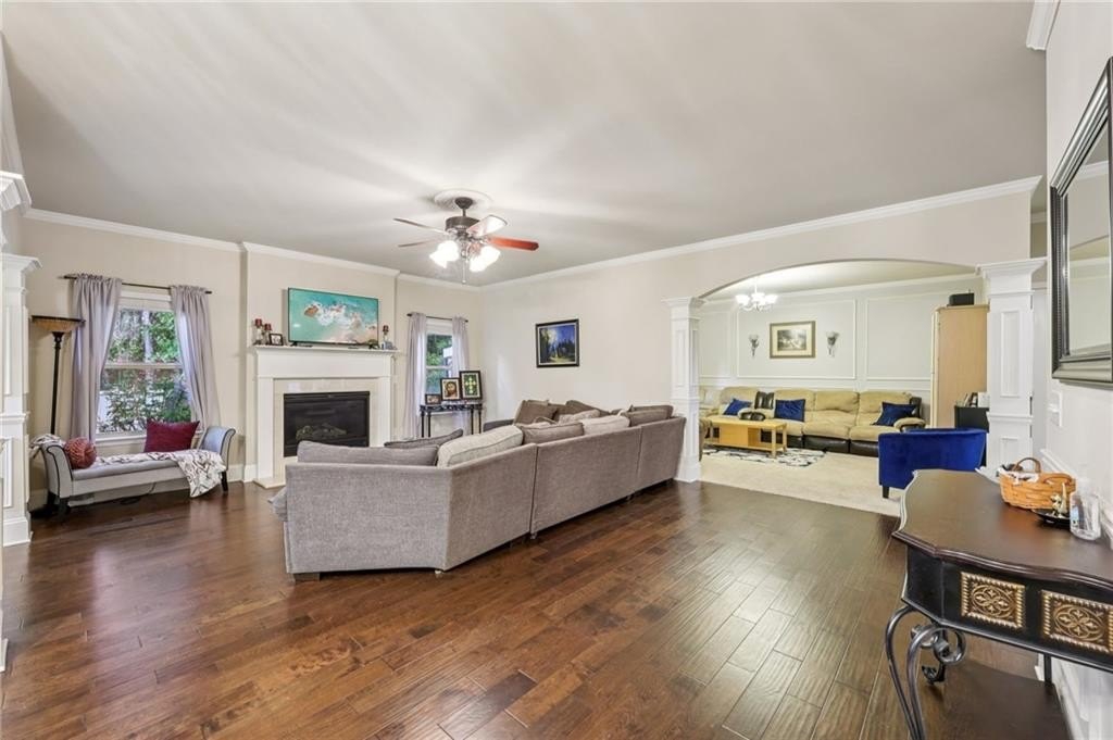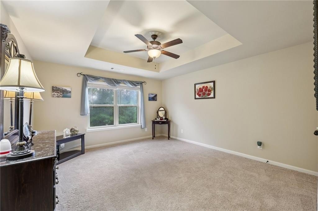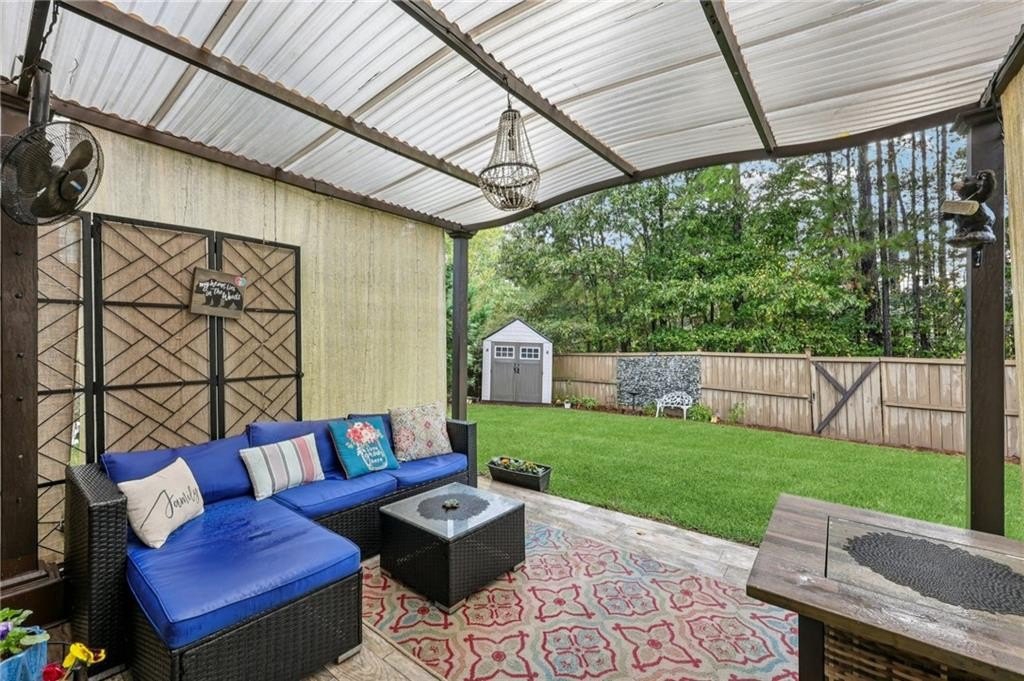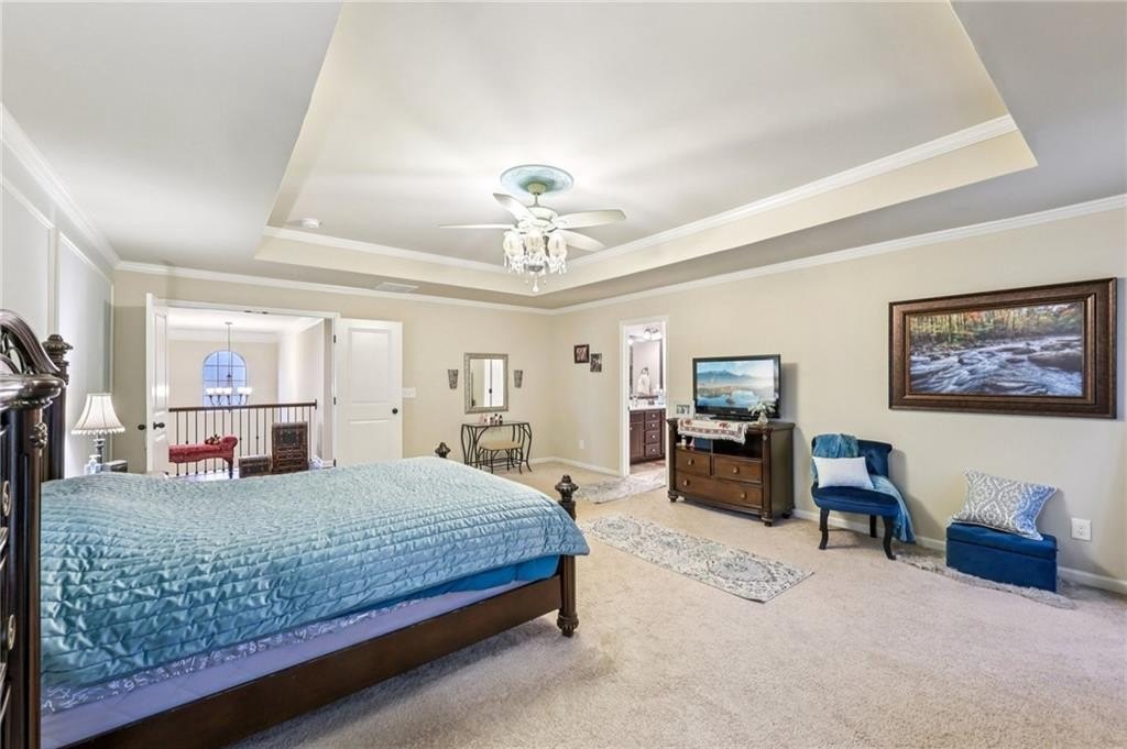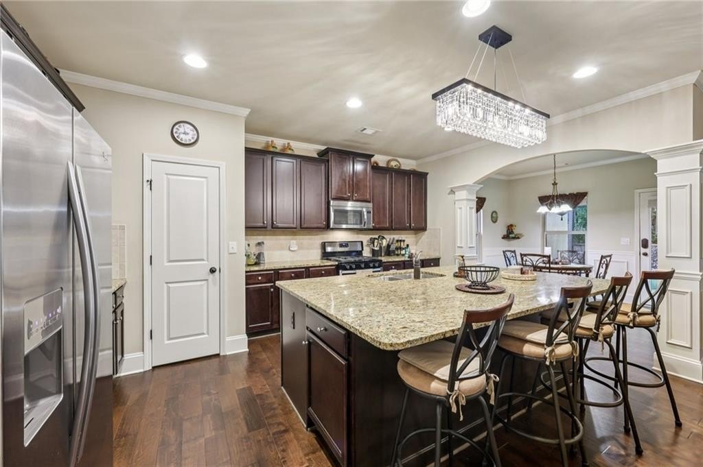 Welcome to this exceptional executive 4 bedroom, 3.5 bath residence, perfectly poised on a beautifully landscaped, level corner lot of just over an acre, with the property extending well beyond the fenced backyard for added privacy and space. A striking brick front exterior and charming curb appeal set the tone, leading into a grand 2-story foyer adorned with gleaming hardwood floors, wainscoting, decorative columns, and elegant arched doorways that create an immediate sense of sophistication. The main level offers a seamless blend of comfort and style with a formal open-concept dining room crowned by a coffered ceiling, a gracious formal living room, and a warm and inviting family room highlighted by a cozy gas log fireplace. The chef’s kitchen is a true showstopper, featuring rich cherry-stained cabinetry, gleaming granite countertops, a massive center island, stainless steel appliances, a convenient breakfast bar, and a sunlit breakfast area that overlooks the backyard oasis. Upstairs, the oversized owner’s suite is a private retreat, complete with a French door entry, elegant tray ceiling, spacious walk-in closet, and a luxurious spa-inspired bath with double vanities, a soaking tub, and a separate shower. Secondary bedrooms are impressively large, each with tray ceilings, including a private guest suite with its own bath and walk-in closet—perfect for family or visitors. Thoughtful upgrades abound, including crown molding, recessed lighting, plantation shutters, and smart home features that add modern convenience to timeless design. Step outside to discover an entertainer’s dream backyard, complete with a pergola, gazebo, covered patio, and enchanting solar lighting, all framed by a fenced yard that still leaves room to roam. The 2-car garage is fully insulated with storage space and dual openers, and peace of mind comes with a roof that is only 5 years old.