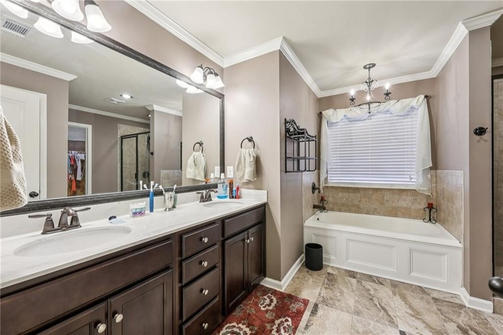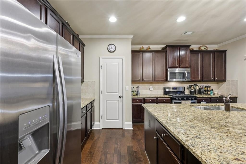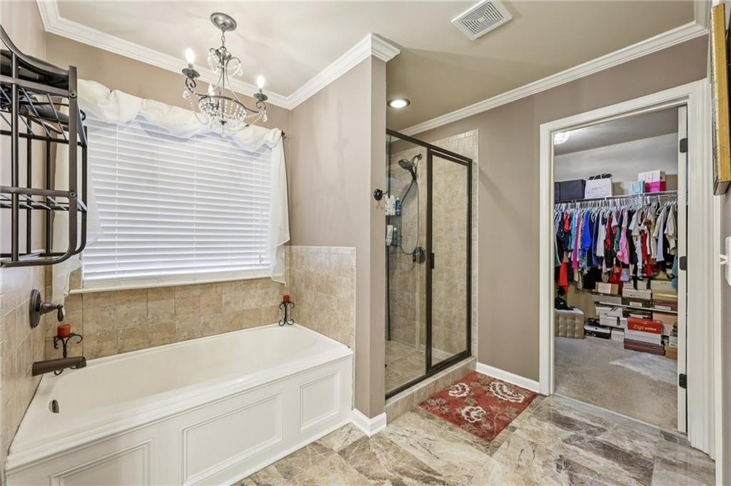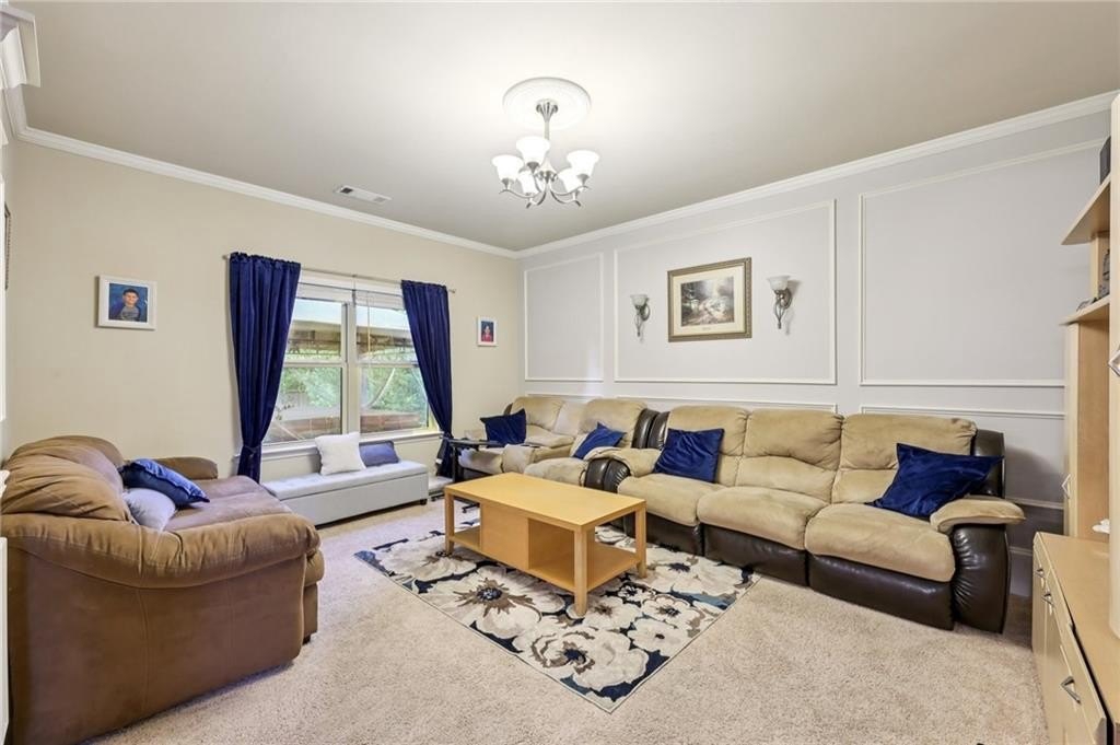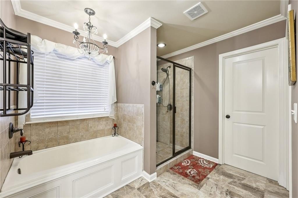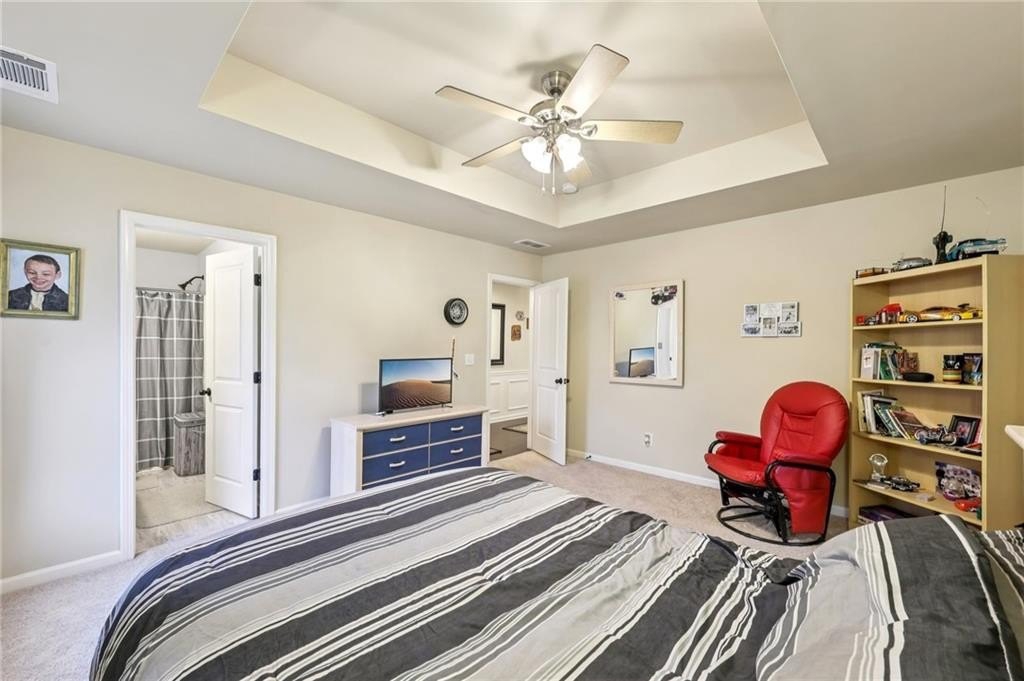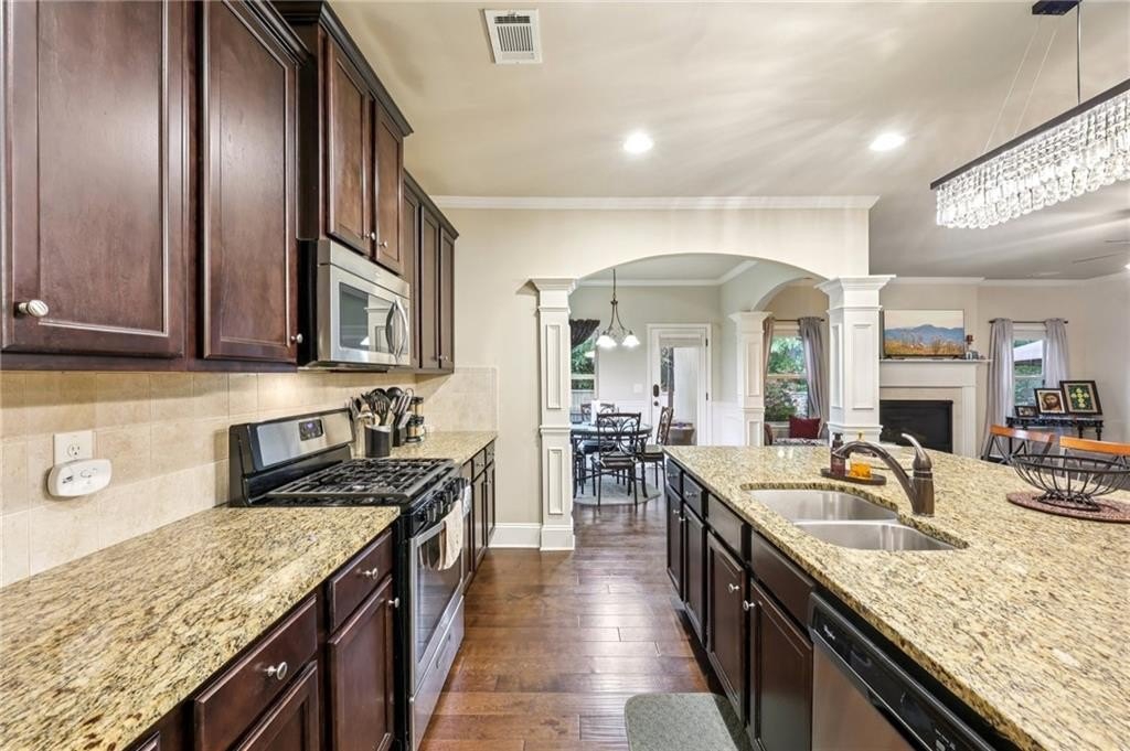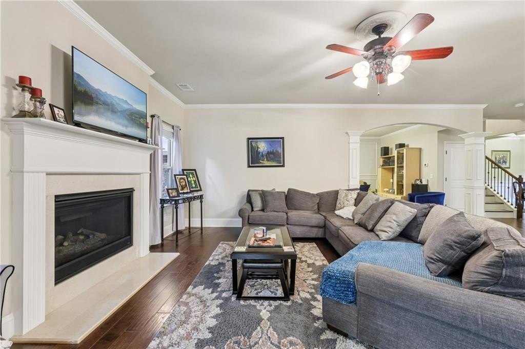 Welcome to this exceptional executive 4 bedroom, 3.5 bath residence, perfectly poised on a beautifully landscaped, level corner lot of just over an acre, with the property extending well beyond the fenced backyard for added privacy and space. A striking brick front exterior and charming curb appeal set the tone, leading into a grand 2-story foyer adorned with gleaming hardwood floors, wainscoting, decorative columns, and elegant arched doorways that create an immediate sense of sophistication. The main level offers a seamless blend of comfort and style with a formal open-concept dining room crowned by a coffered ceiling, a gracious formal living room, and a warm and inviting family room highlighted by a cozy gas log fireplace. The chef’s kitchen is a true showstopper, featuring rich cherry-stained cabinetry, gleaming granite countertops, a massive center island, stainless steel appliances, a convenient breakfast bar, and a sunlit breakfast area that overlooks the backyard oasis. Upstairs, the oversized owner’s suite is a private retreat, complete with a French door entry, elegant tray ceiling, spacious walk-in closet, and a luxurious spa-inspired bath with double vanities, a soaking tub, and a separate shower. Secondary bedrooms are impressively large, each with tray ceilings, including a private guest suite with its own bath and walk-in closet—perfect for family or visitors. Thoughtful upgrades abound, including crown molding, recessed lighting, plantation shutters, and smart home features that add modern convenience to timeless design. Step outside to discover an entertainer’s dream backyard, complete with a pergola, gazebo, covered patio, and enchanting solar lighting, all framed by a fenced yard that still leaves room to roam. The 2-car garage is fully insulated with storage space and dual openers, and peace of mind comes with a roof that is only 5 years old.