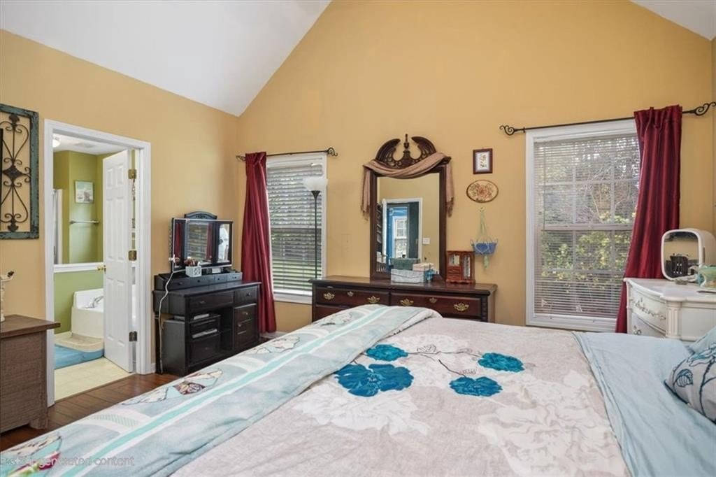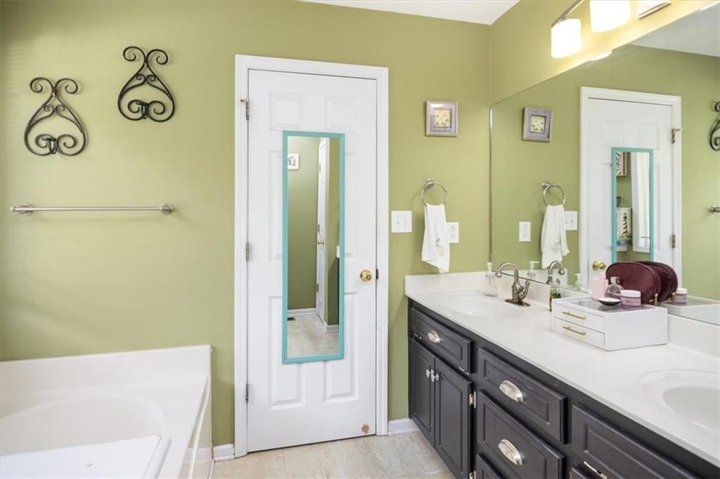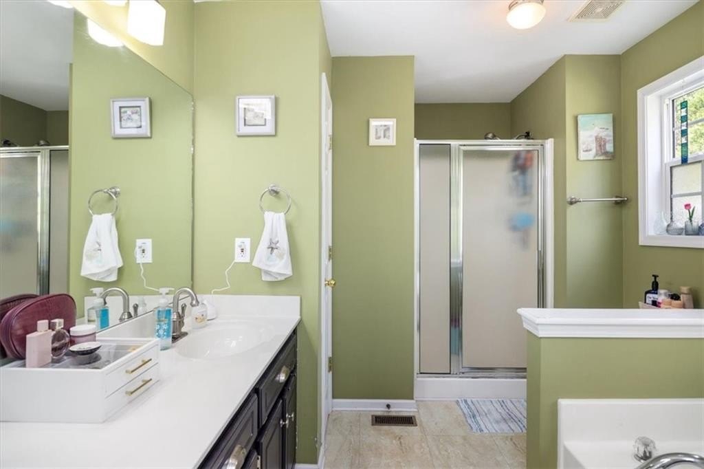 The oversized primary bedroom is a true retreat, complete with a double vanity sink, soaking tub, and ample space to unwind.