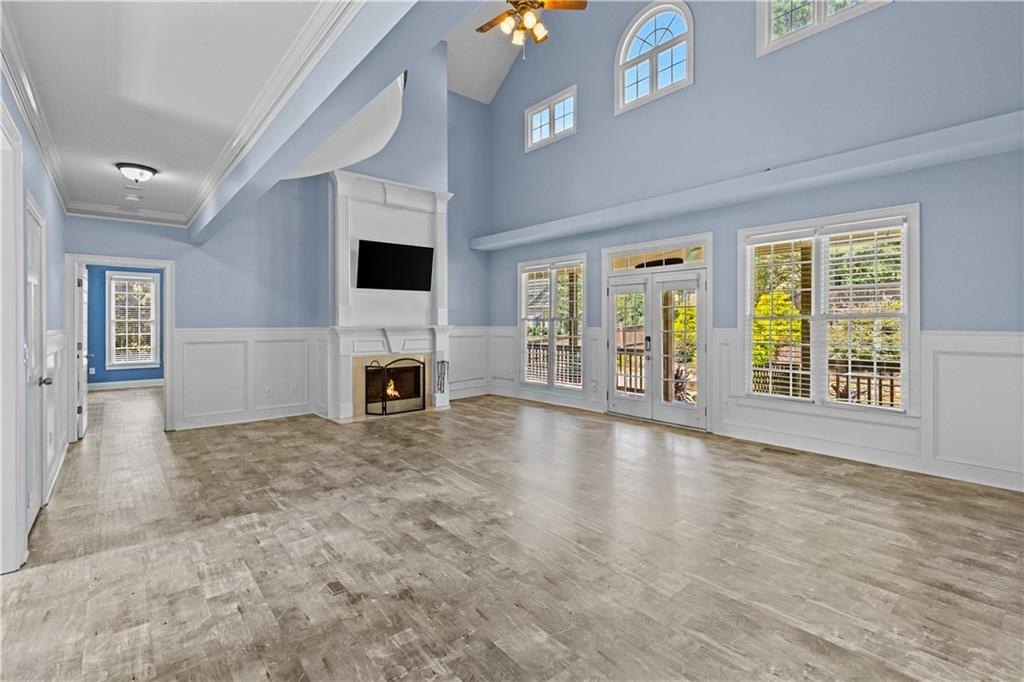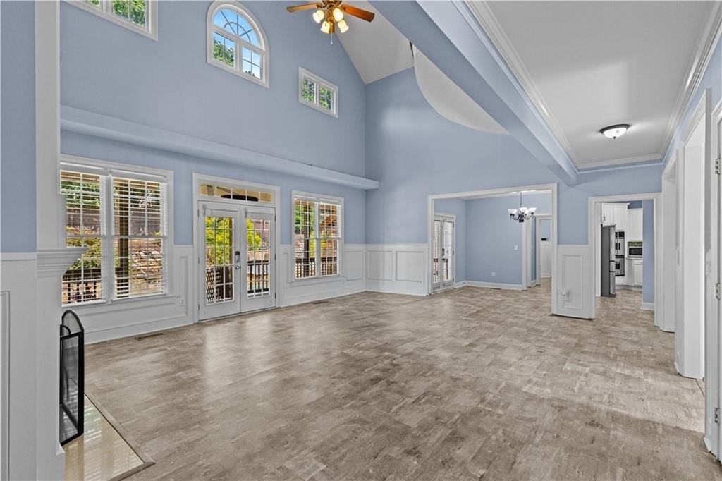 Grand open floor plan with soaring ceilings and expansive windows showcasing stunning natural light