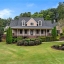 Professionally landscaped grounds with lush greenery and exceptional curb appeal framed by a stately brick and stone façade